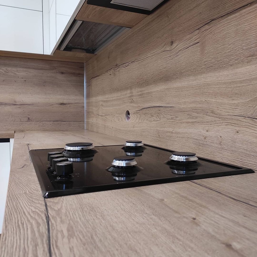 Однотонный древесный цвет фасадов из ЛДСП. Ширина кухни 140 см.