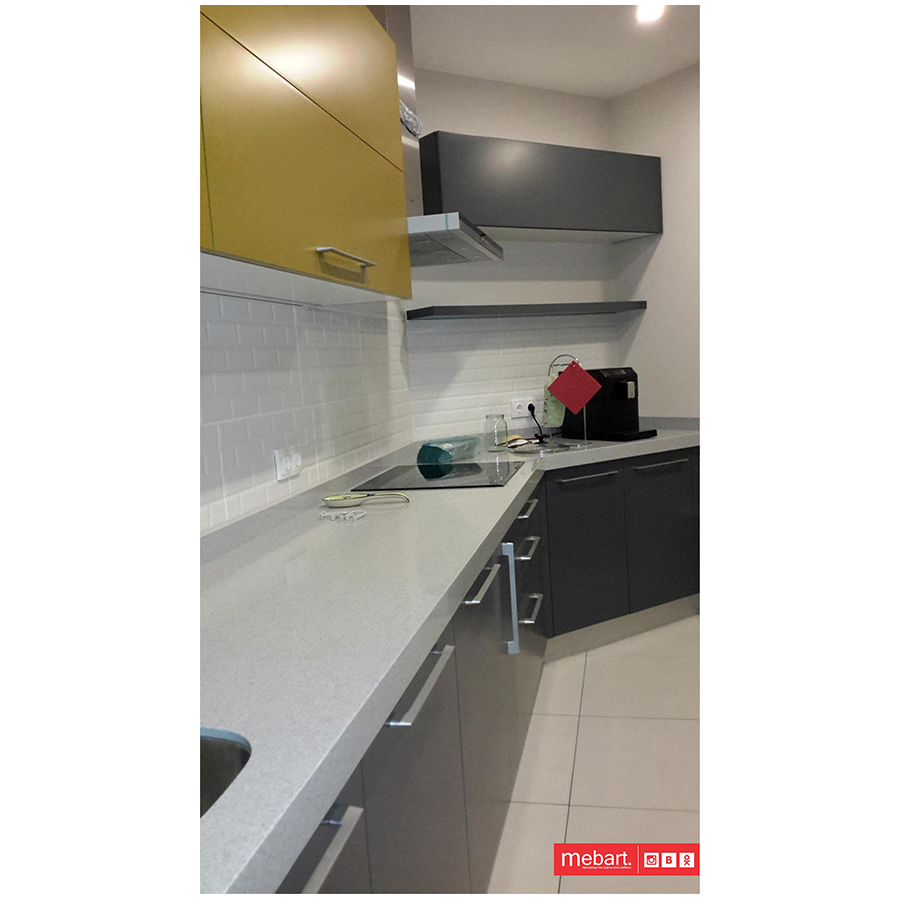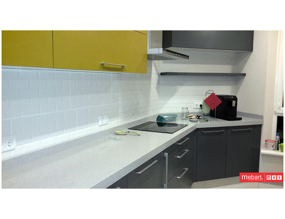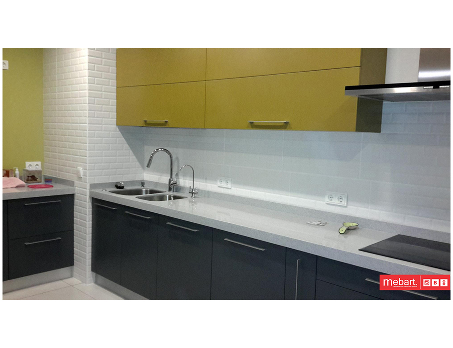 Комбинированная кухня с современным дизайном представлена в виде угловой конструкции. Створки шкафчиков оснащены удобными ручками, покрытыми хромом. Широкая столешница позволит разместить продукты питания и посуду для приготовления пищи.