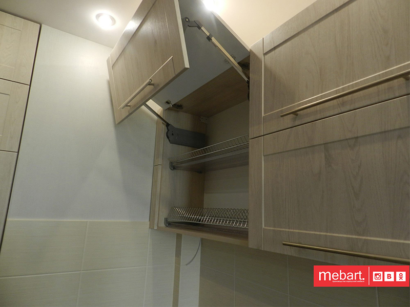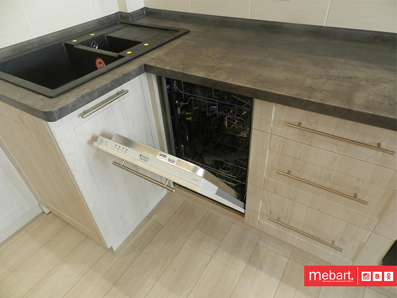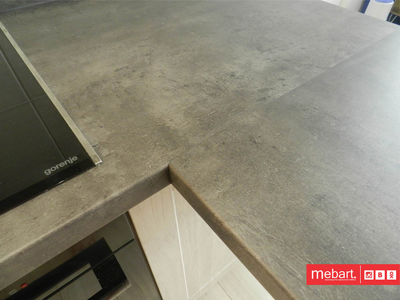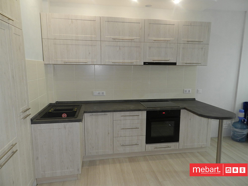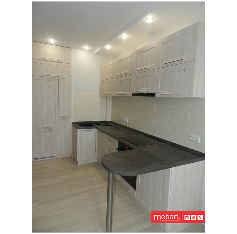 Современная кухня отличается компактными размерами и стильным дизайном. Кроме вместительных шкафчиков в комплекте имеется миниатюрная стойка, зафиксированная на металлической ножке. Ударопрочная столешница представлена в темном цвете, который отлично гармонирует со светлыми створками подвесных и напольных модулей.