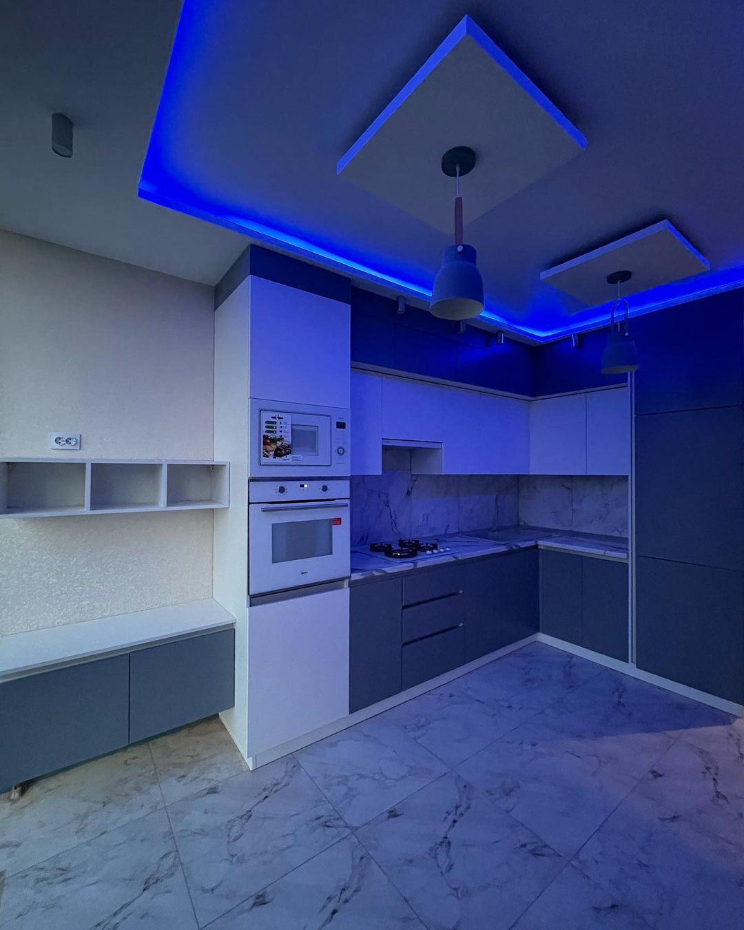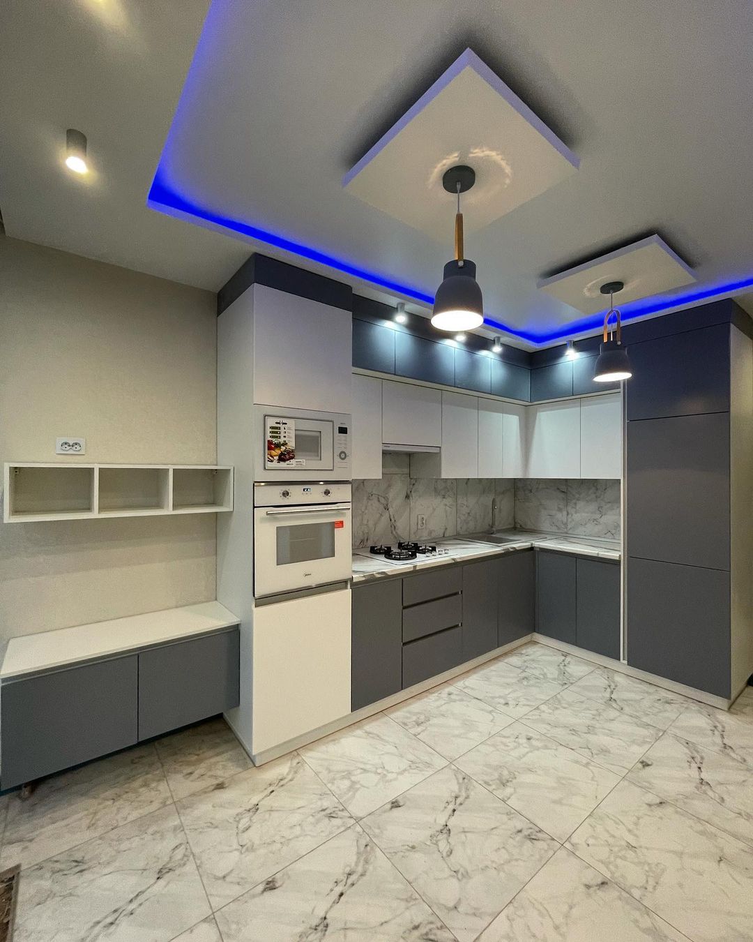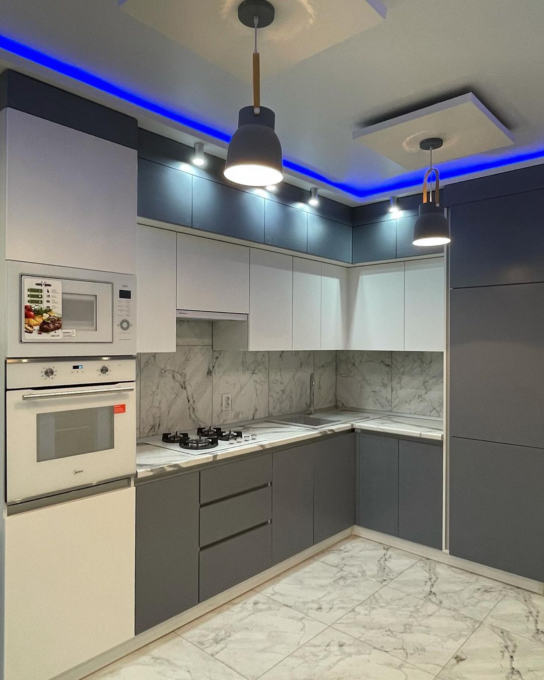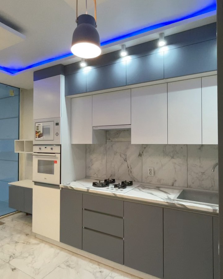 Современная кухня с бело-серыми матовыми фасадами
