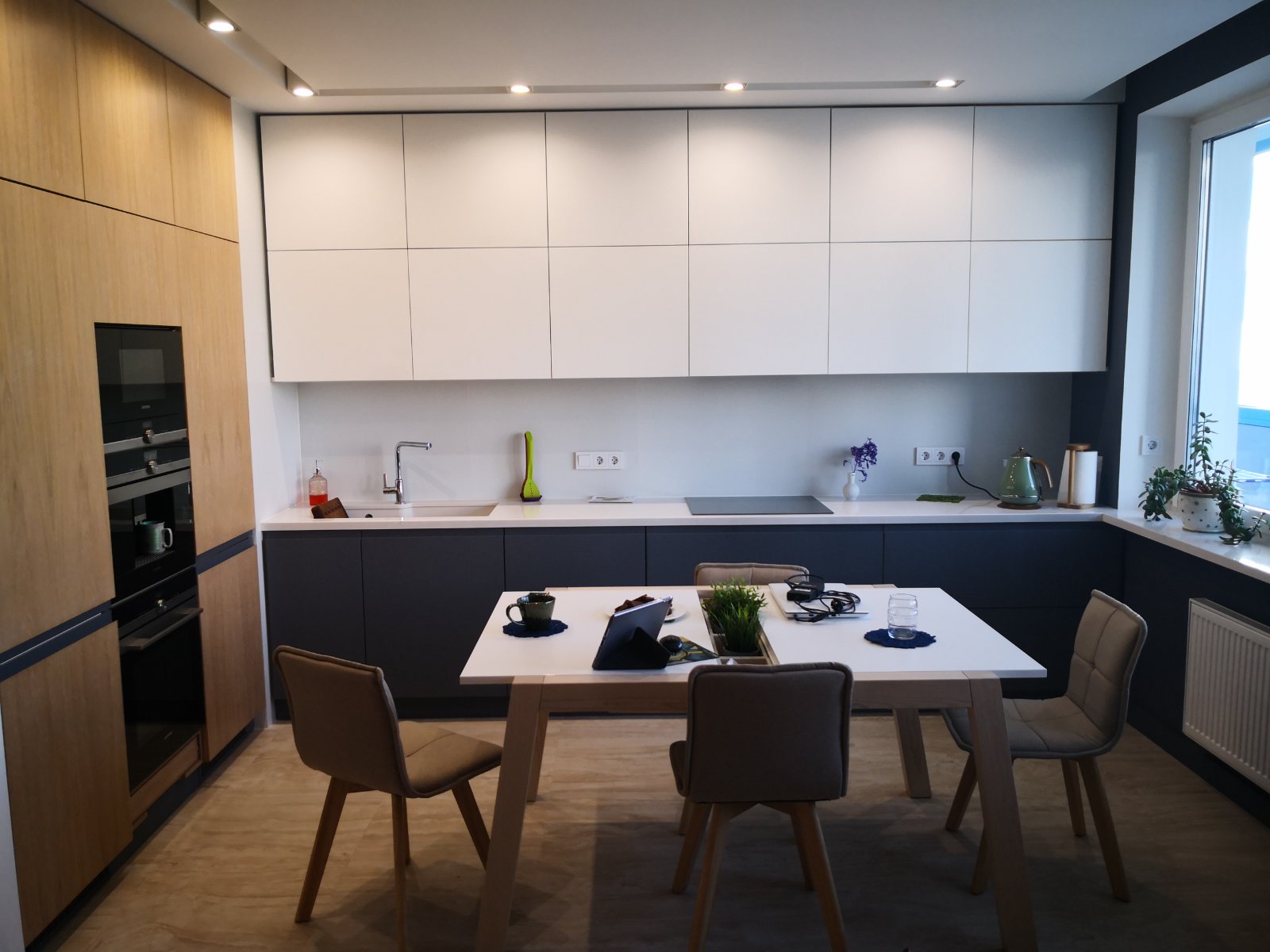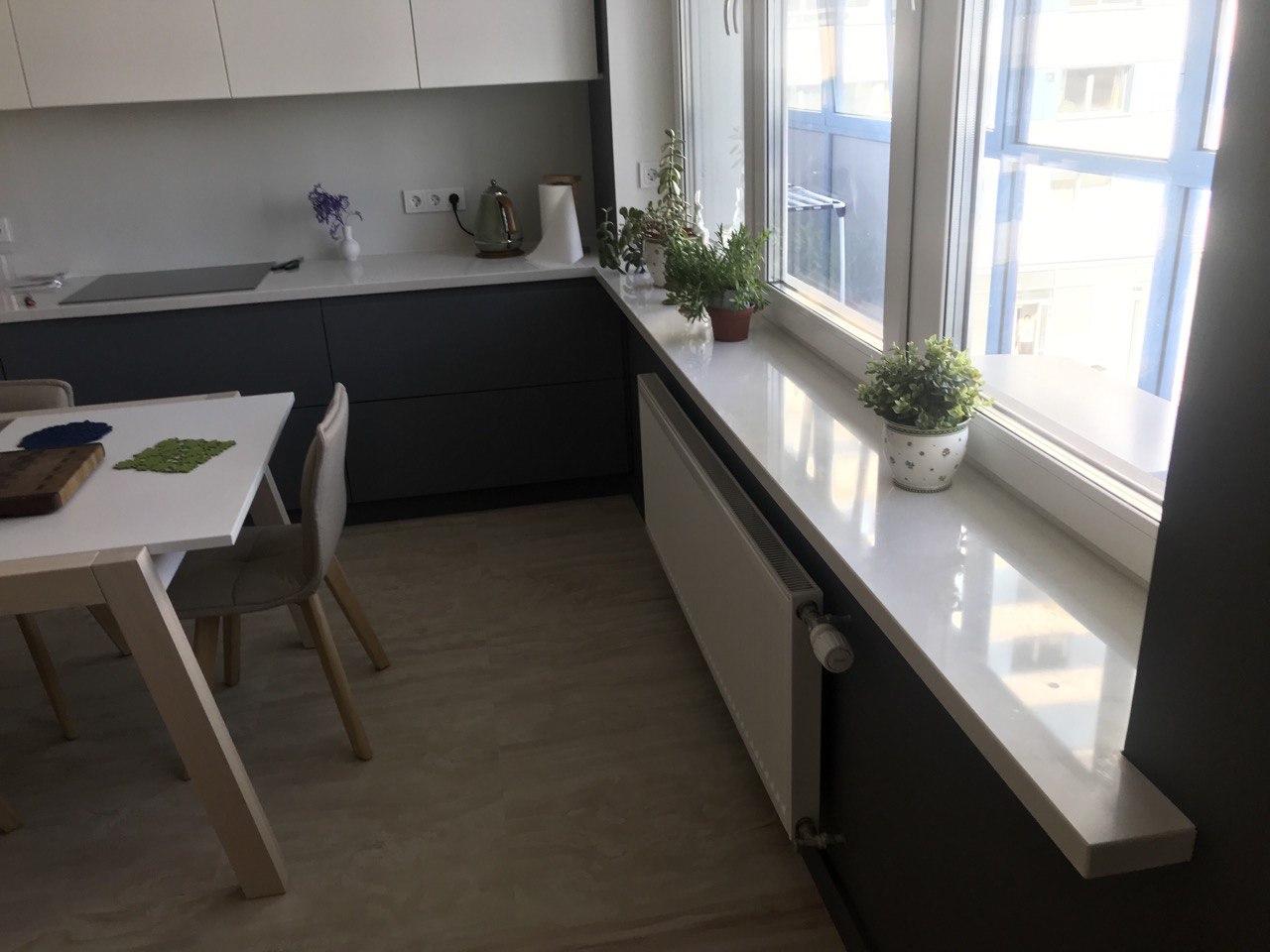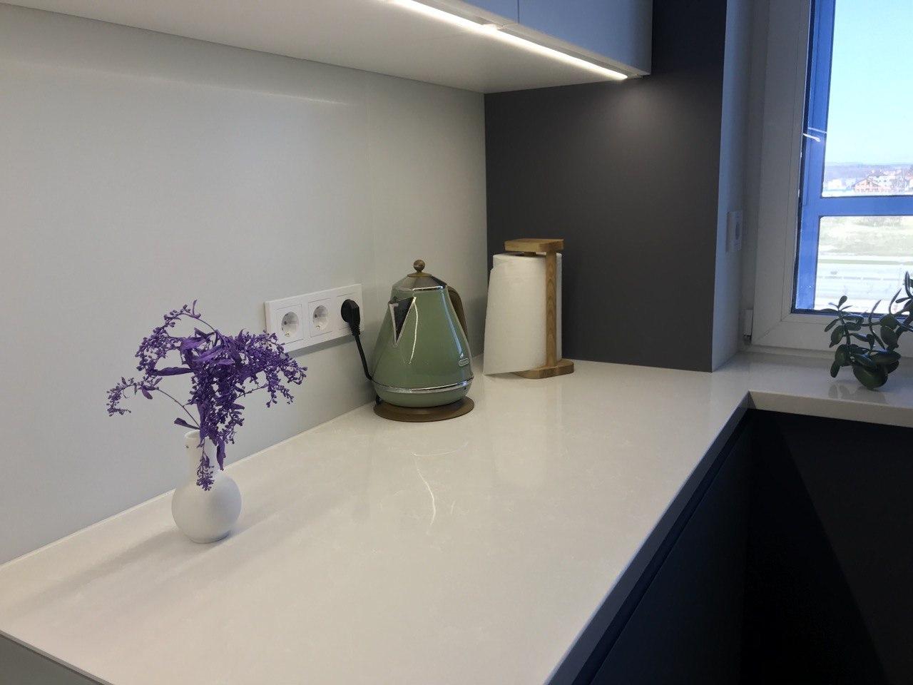 Фасады матовые из крашеного МДФ. Фурнитура: Blum (Австрия).