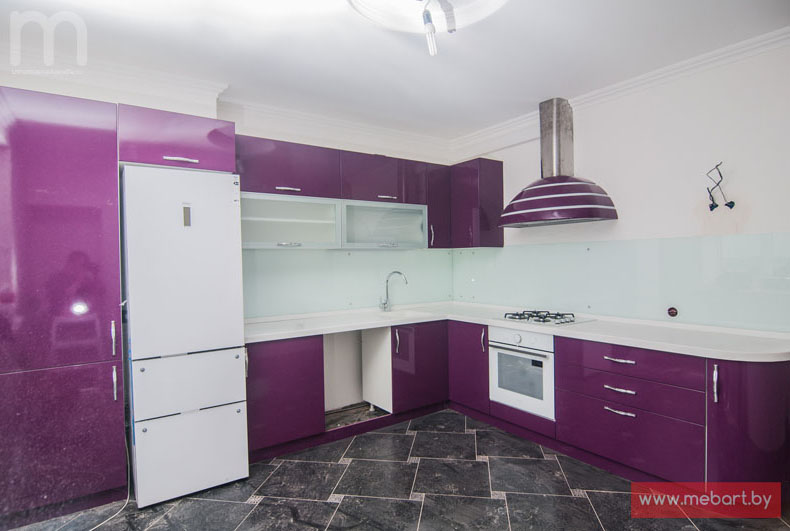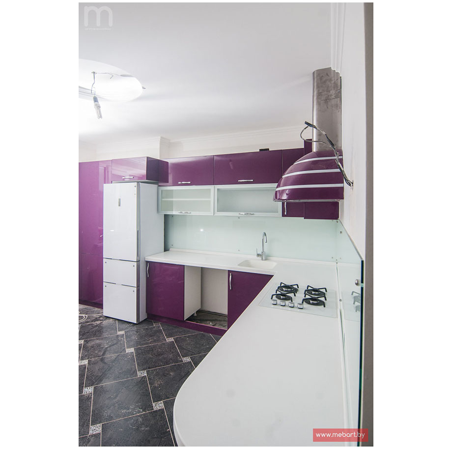 Угловая кухня с металлическими ручками дополнена яркими скинали из закаленного стекла с изображением цветов. Глянцевые фасады модели исполнены в сочетании белого и фиолетового цветов. Одной из конструктивных особенностей кухни является наличие вертикального пенала с нишей для духового шкафа.