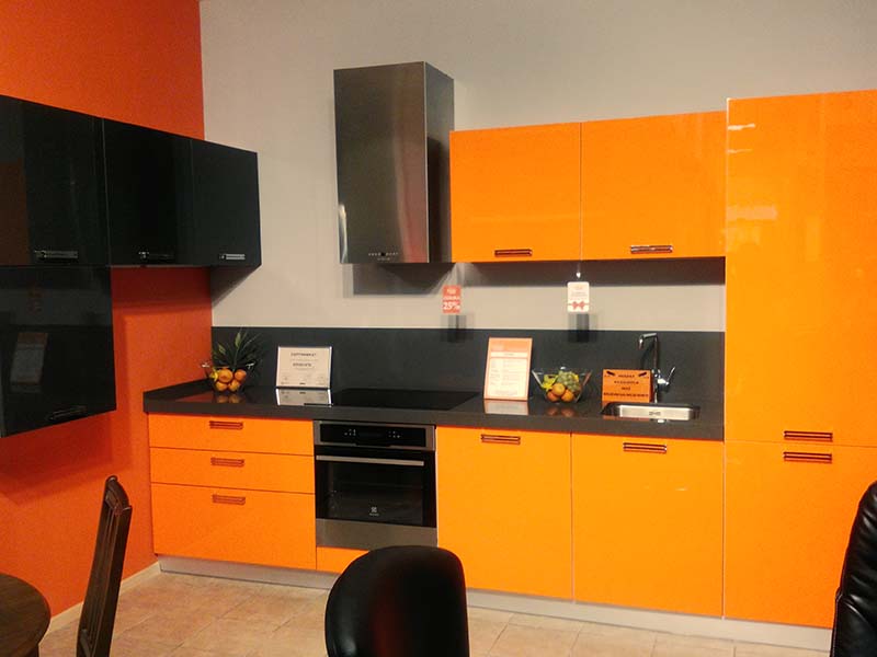Кухонный гарнитур исполнен в ярком оранжевом цвете. Насыщенный оттенок оттеняет темно-серая столешница. Фасады имеют глянцевое покрытие, а также небольшие металлические ручки. Нестандартная расцветка наполнит комнату теплом и задаст хорошее настроение на весь день.