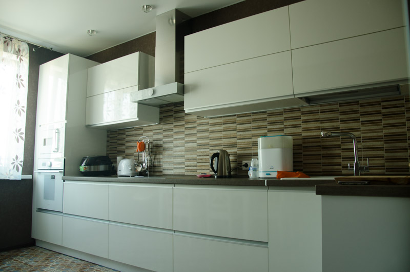 Классическая линейная кухня оборудована глянцевыми белыми фасадами, которые создают в помещении очень светлую и уютную обстановку. Стиля добавляет скрытая фурнитура, которая обеспечивает доступ к содержимому шкафчиков с помощью легкого нажатия на створку. Большая вместительность позволяет расположить всю необходимую посуду.