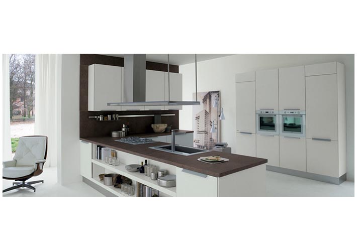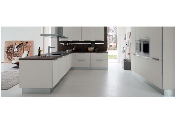 Интегрированные ручки, надежная фурнитура, ниши для встраиваемой техники, матовые фасады.