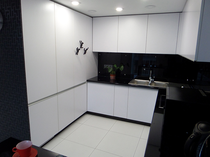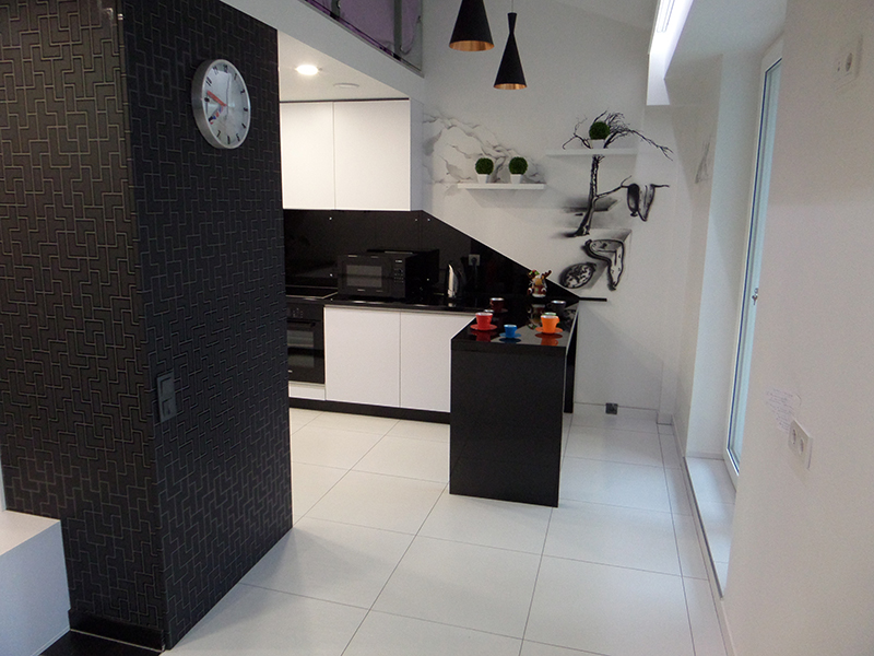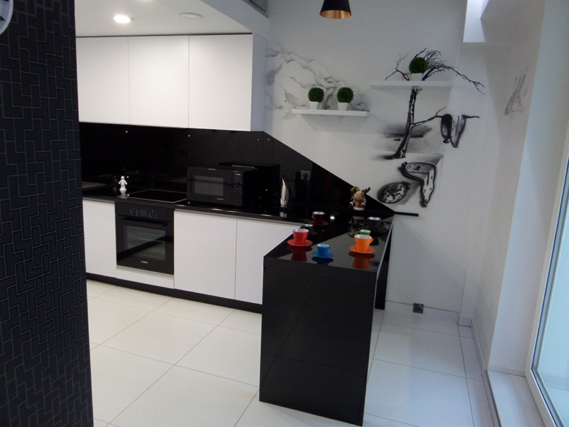 Угловая кухня выполнена из высококачественных материалов в современном стиле. подвесные и напольные шкафчики окрашены в белый цвет, а скинали и барная стойка, напоминающая небольшой обеденный стол, представлены в черном тоне. В комплекте также имеется несколько открытых полочек для предметов декора.
