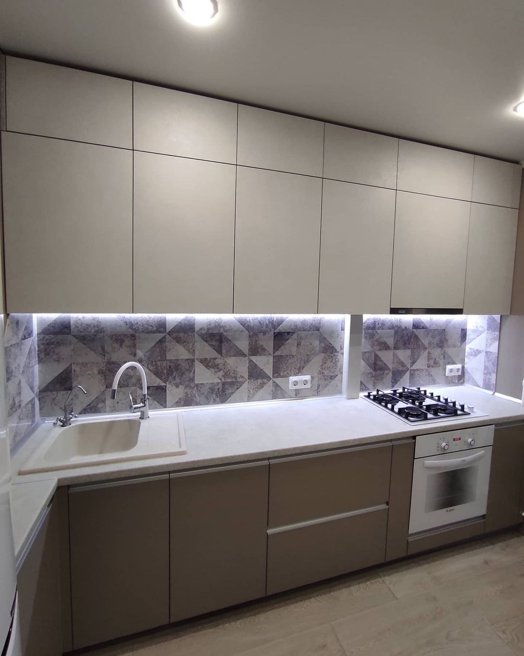 Прямая конструкция, полный комплект из навесных и напольных шкафов.