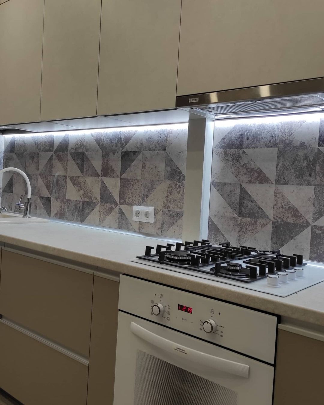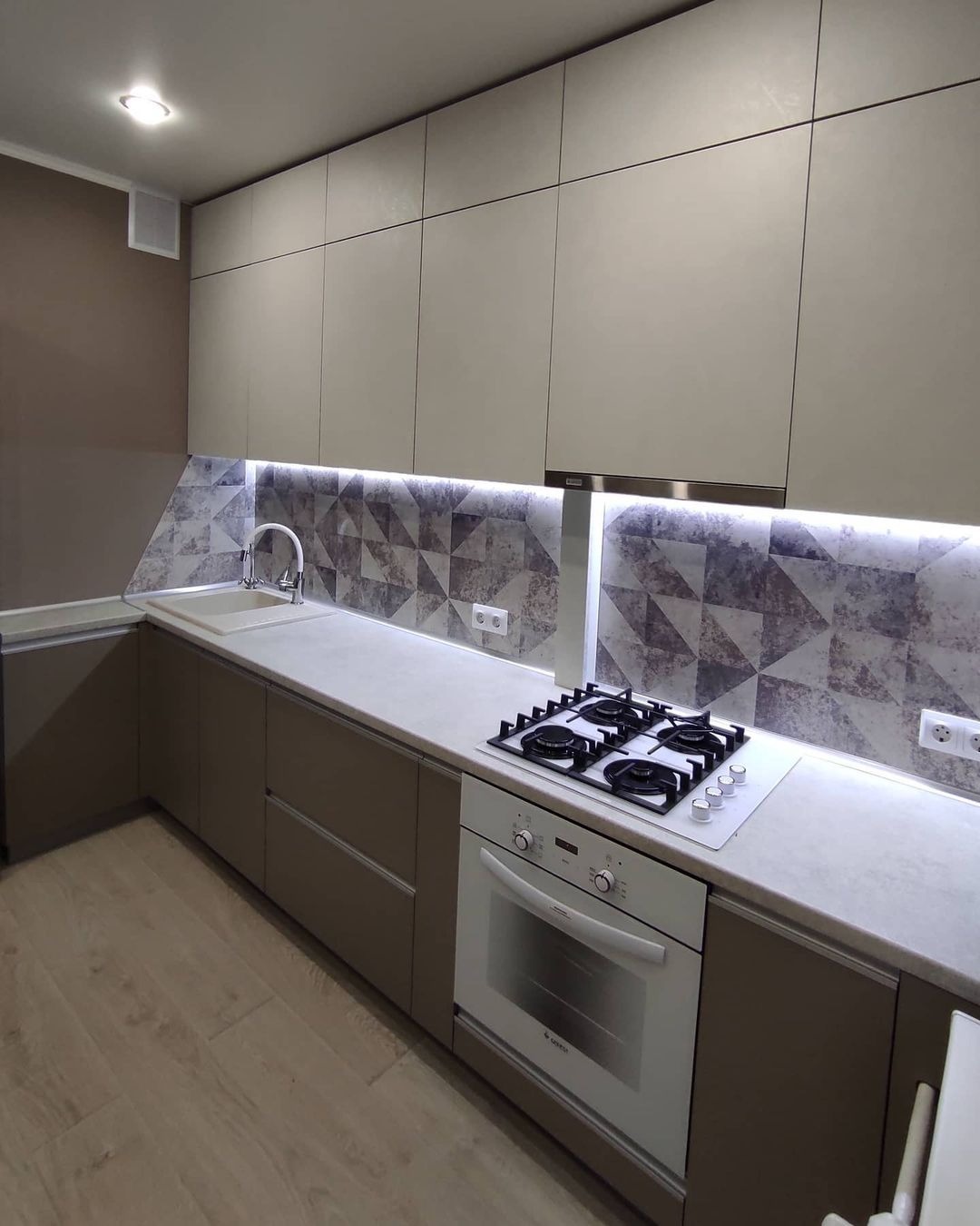 Светлые фрезерованные фасады. Ширина кухни 150 см.