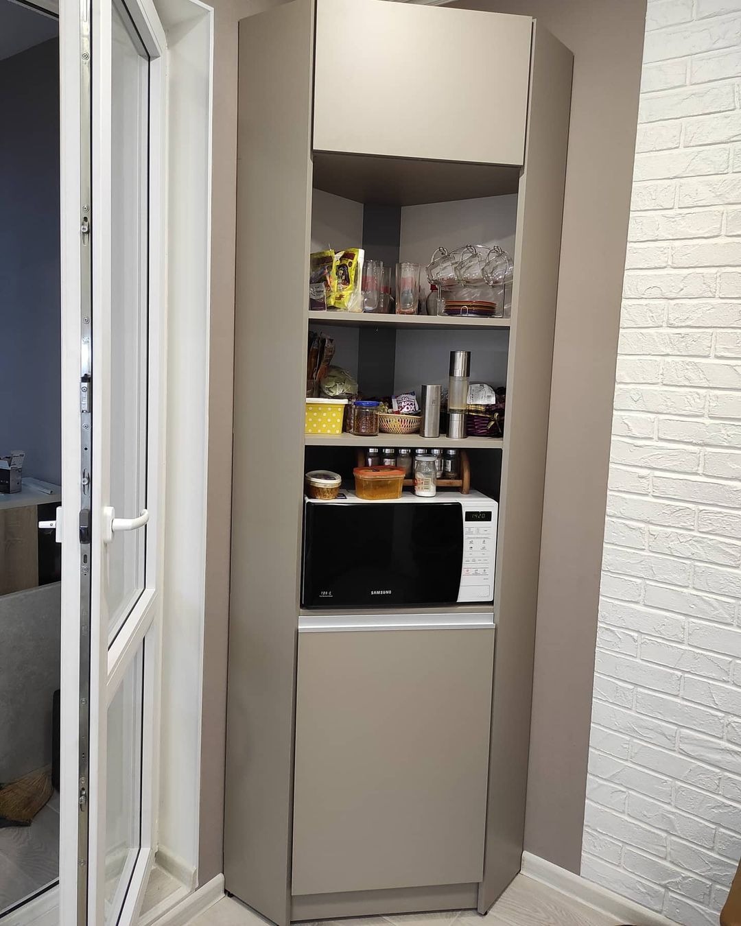 Функциональный гарнитур с распашными матовыми фасадами двух цветов.