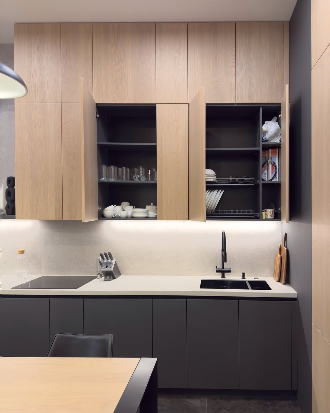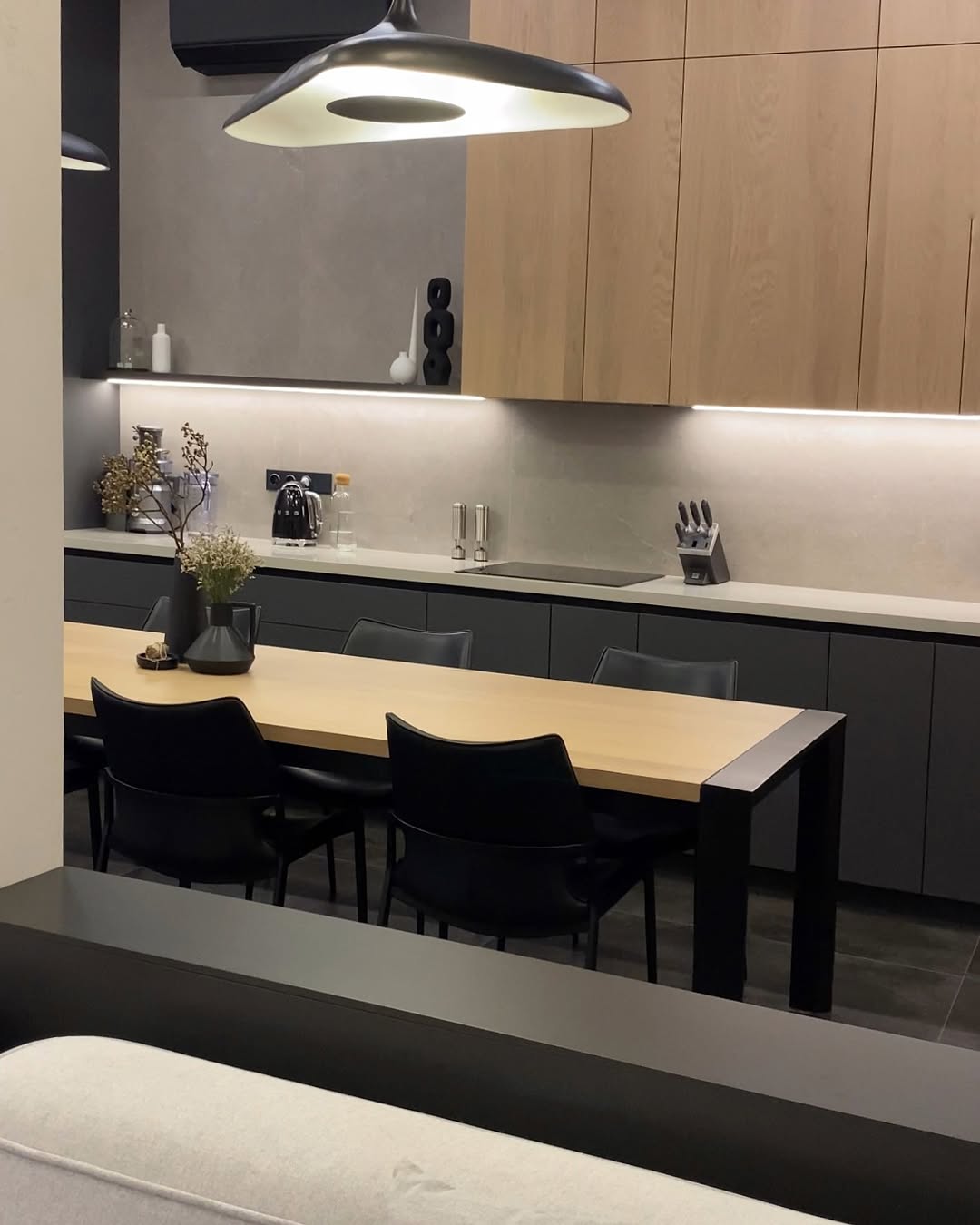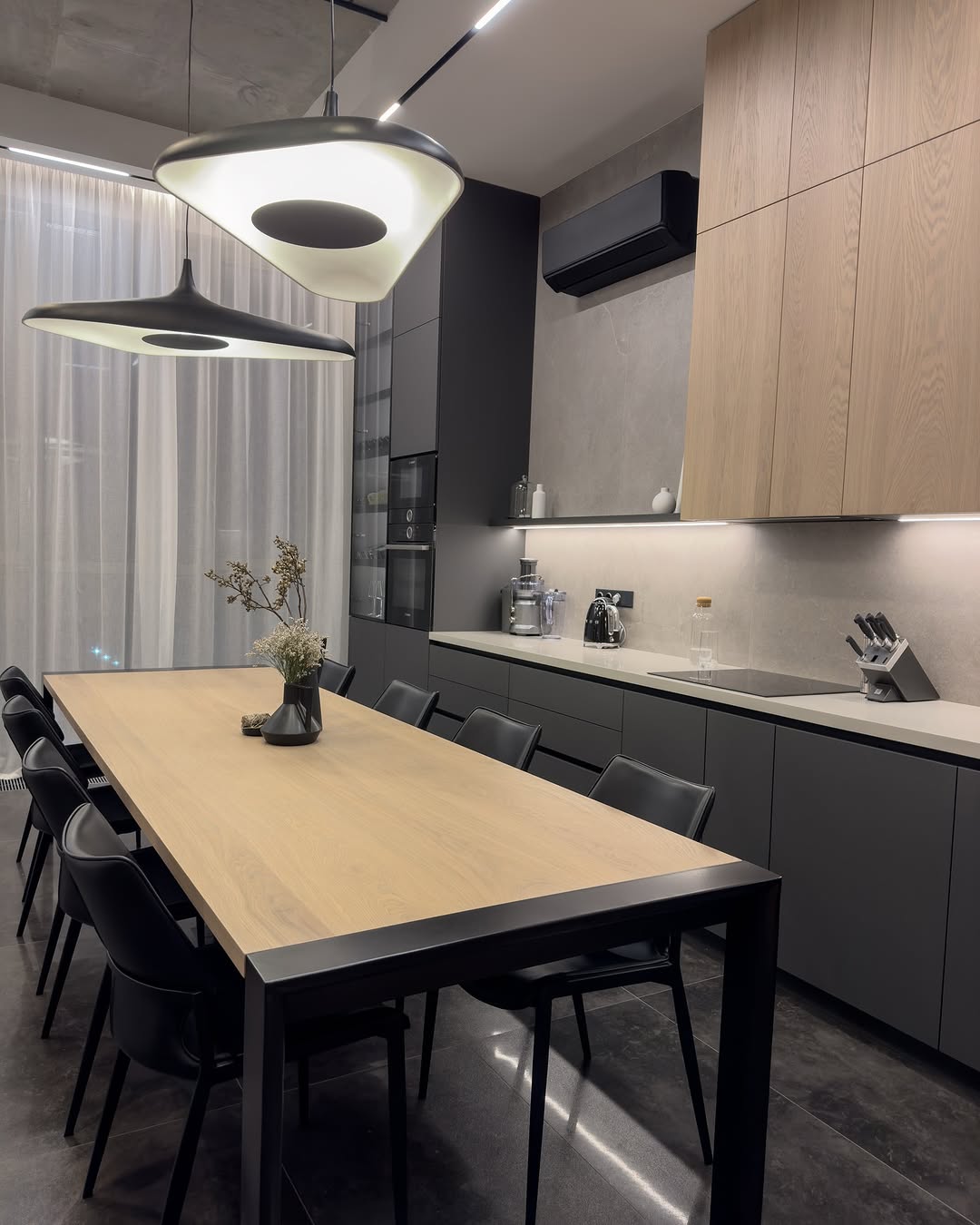 Современная кухня с элементами премиум-дизайна — идеально подойдёт для просторной квартиры или загородного дома. Контраст тёмных фасадов и светлого дерева создаёт эффект глубины и уюта.