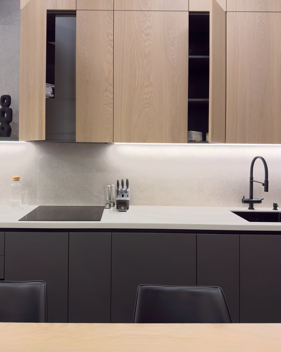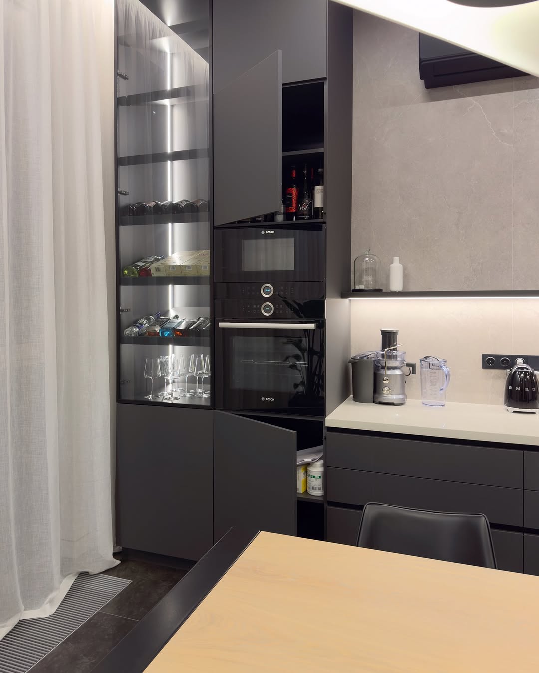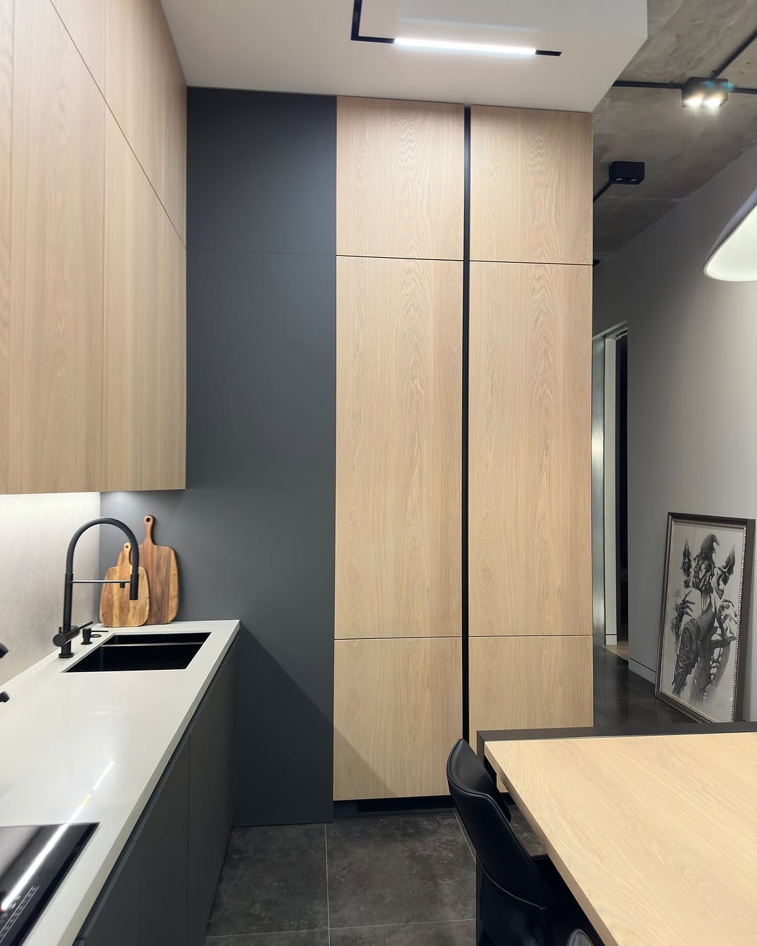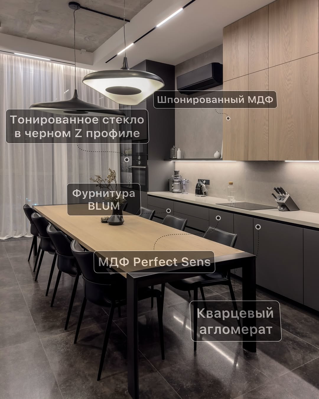 Современная кухня с элементами премиум-дизайна — идеально подойдёт для просторной квартиры или загородного дома. Контраст тёмных фасадов и светлого дерева создаёт эффект глубины и уюта.