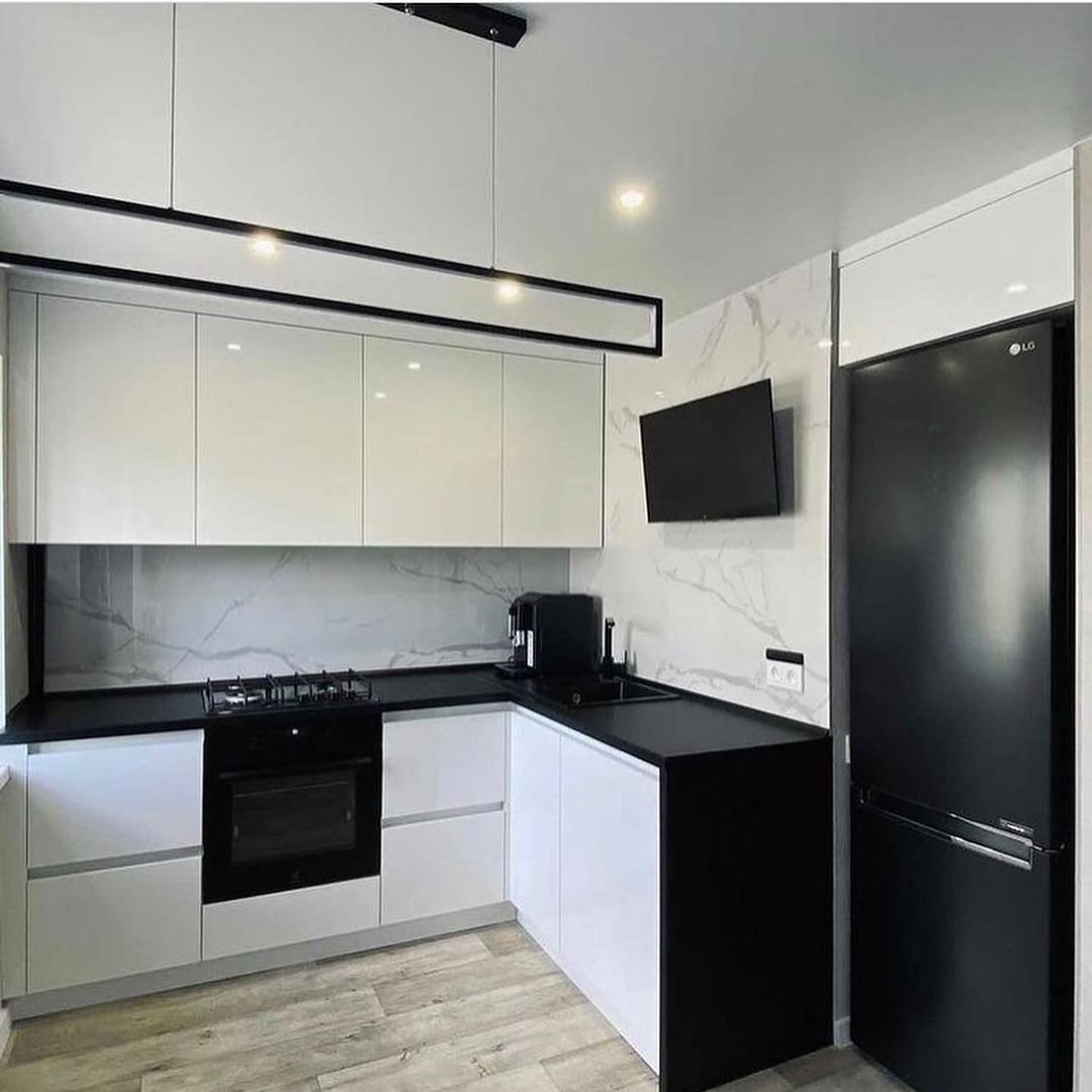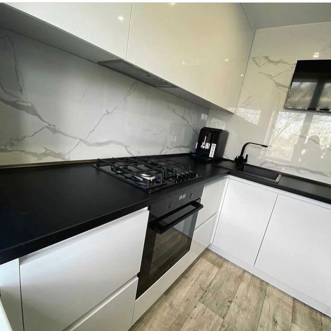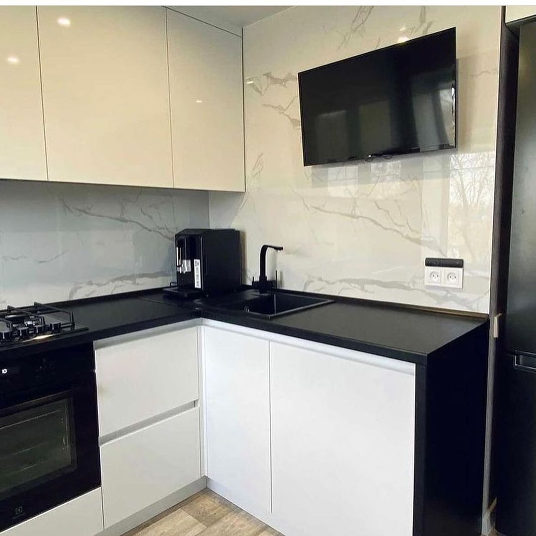код 117584Белые фасады, черная матовая столешница, интегрированные ручки.