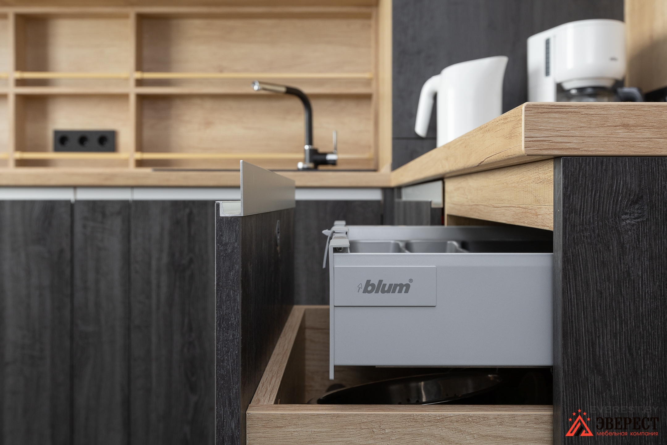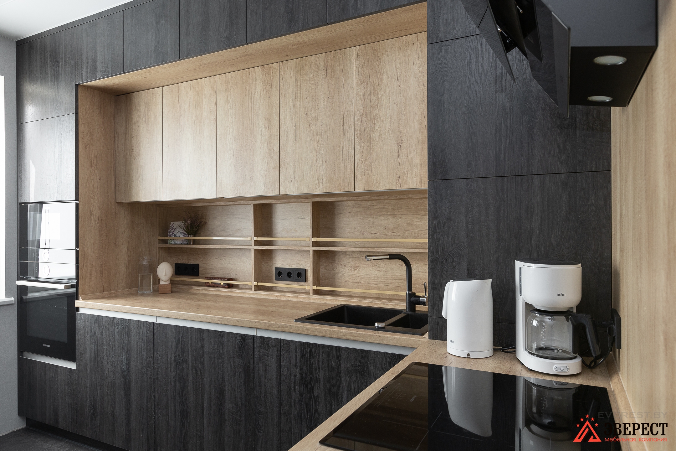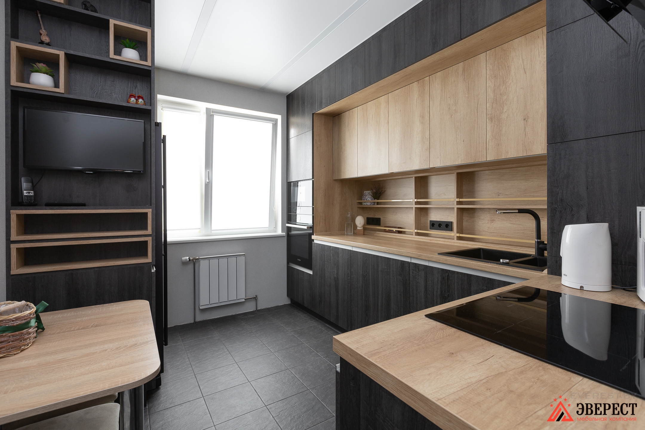 код 111115Материал: ЛДСП EGGER. Угловая модель кухни под потолок с дополнительным пеналом.