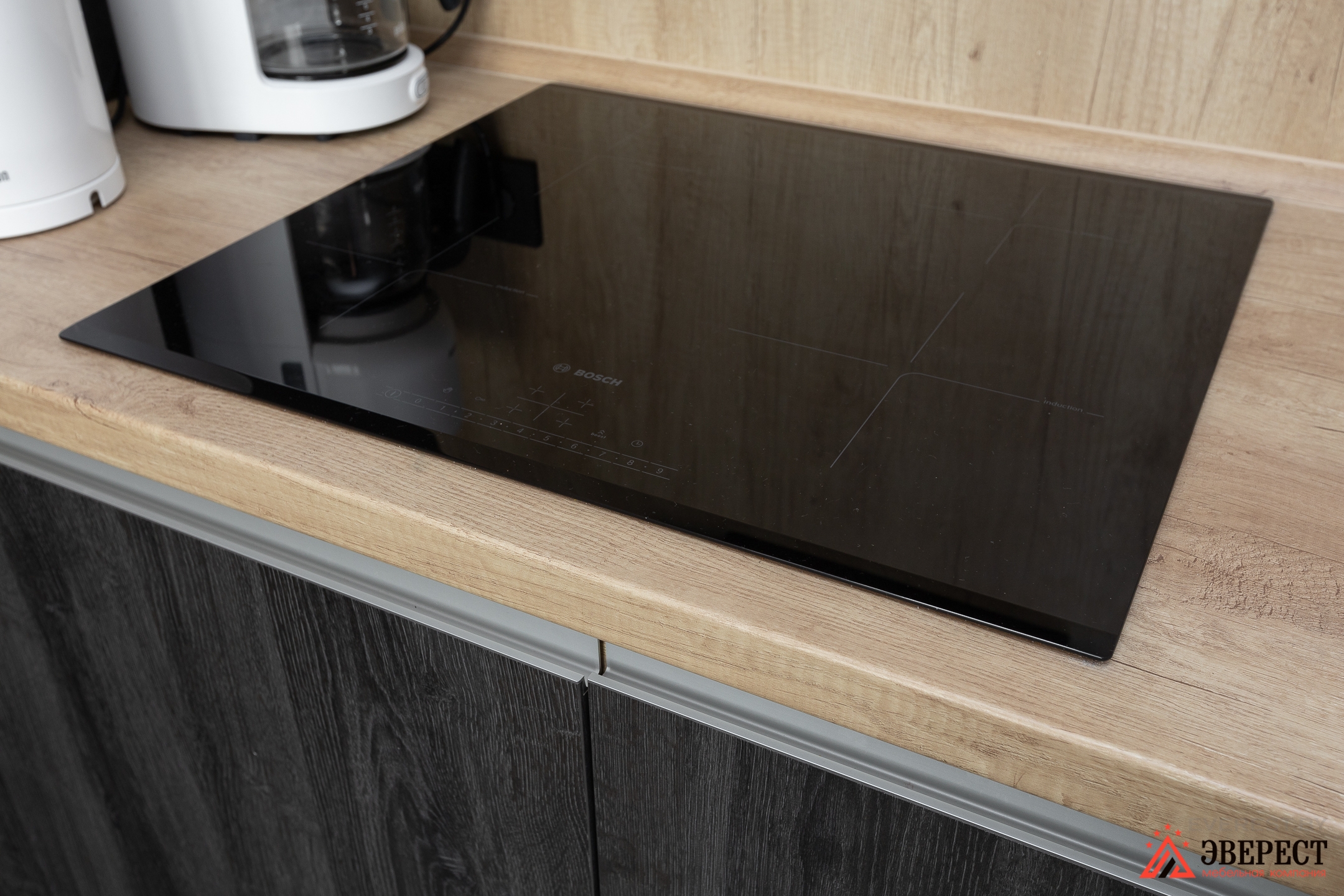 Кухня фабричная с раздельной столешницей. Два ряда навесных шкафов.