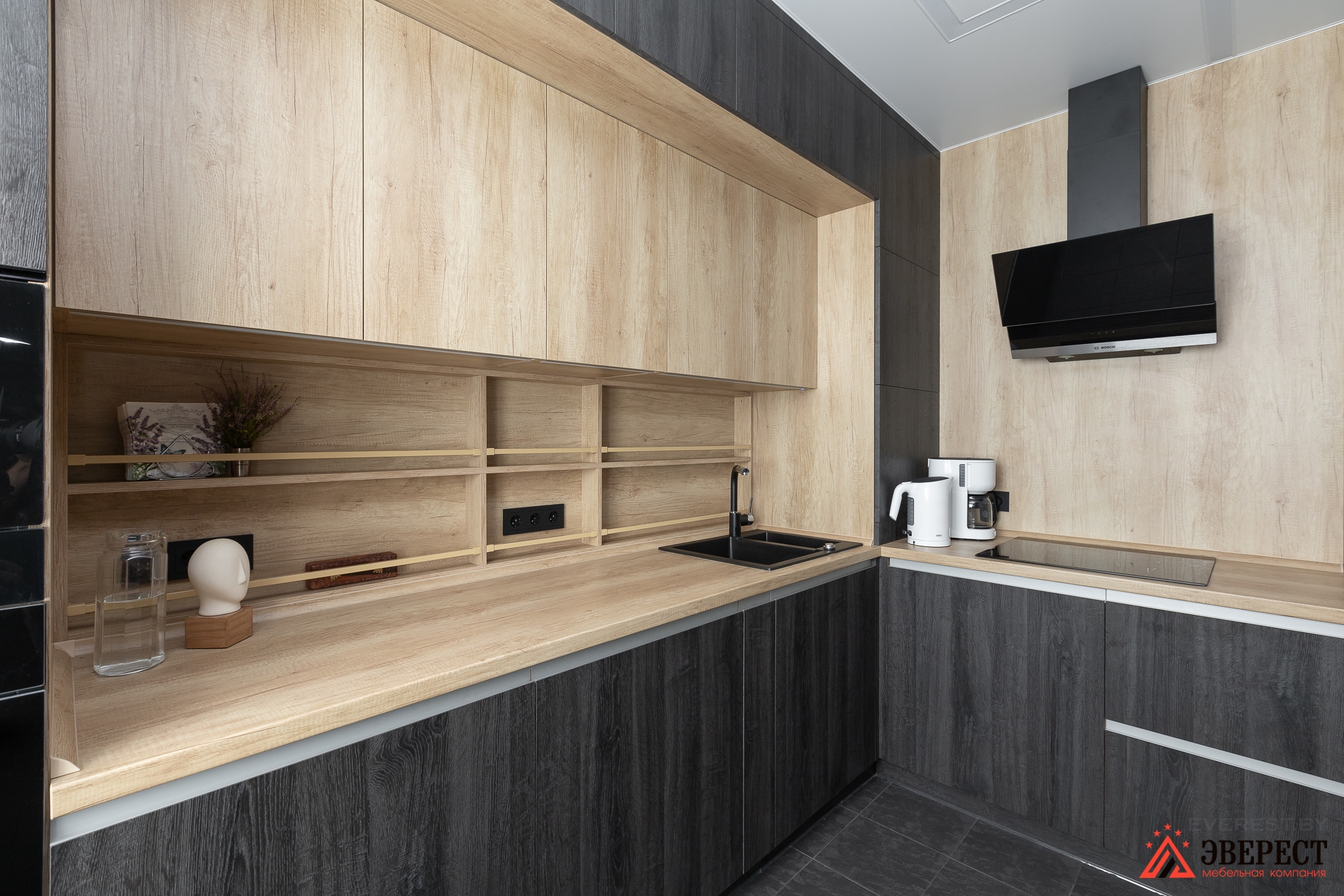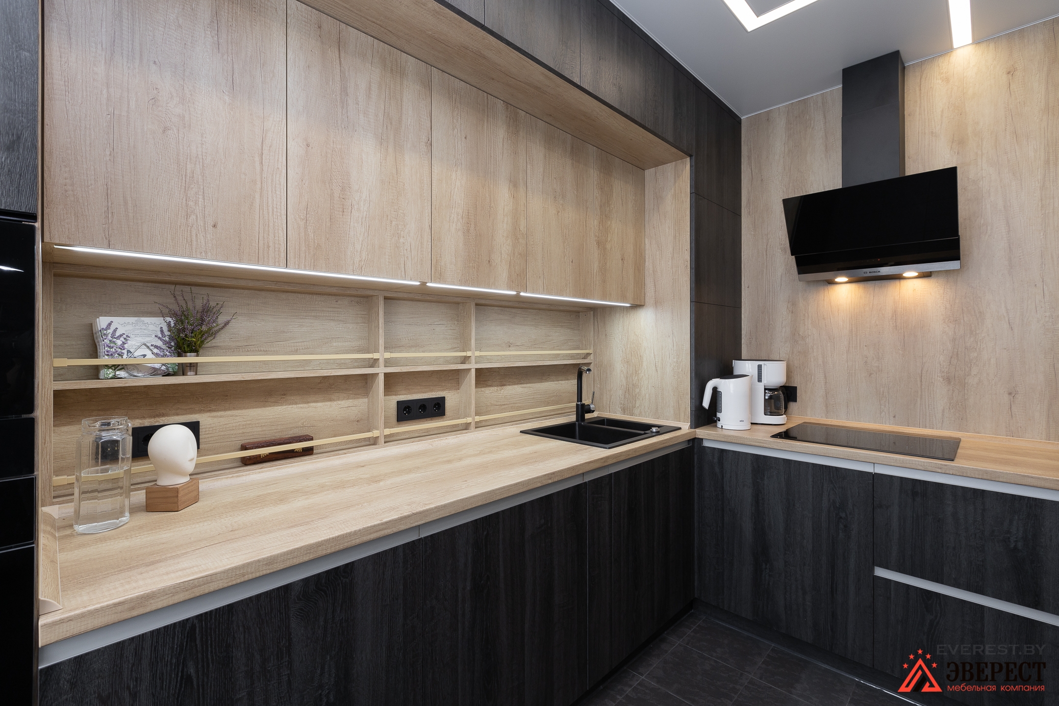Материал фасада и корпуса: ЛДСП 16 мм. Ширина кухни 220 см.