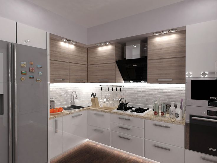 Современная угловая кухня с комбинированными фасадами добавит помещению приятную атмосферу, способствующую принятию гостей. Гарнитур изготовлен в специальных размерах, которые отлично подойдут большой и просторной кухне. Верхние подвесные модули оборудованы яркой точечной подсветкой, служащей дополнительным источником света.