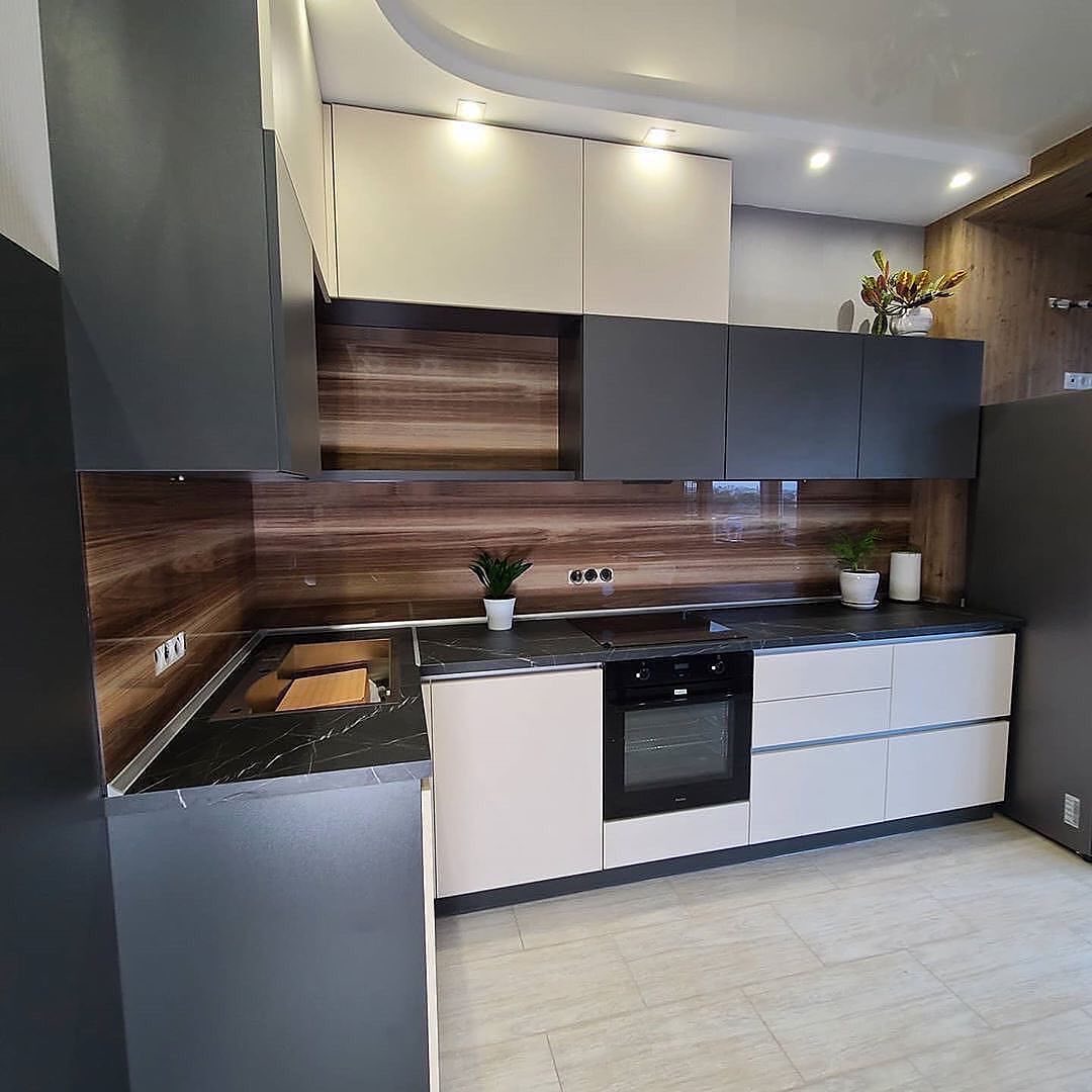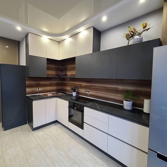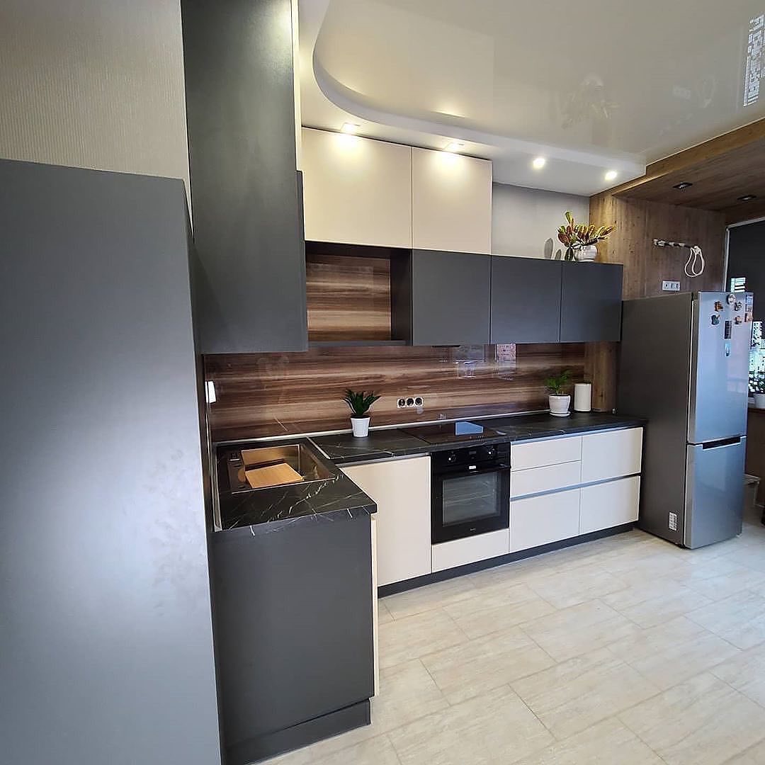 Контрастное сочетание цветов. Ниши для техники. Фасады без ручек.