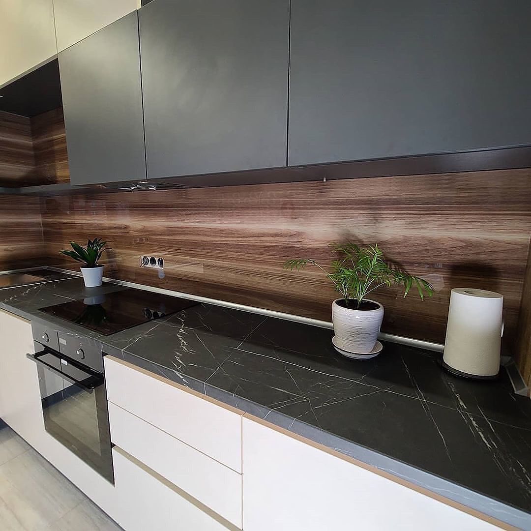 Сочетание светлого тона створок и древесного оттенка столешницы.