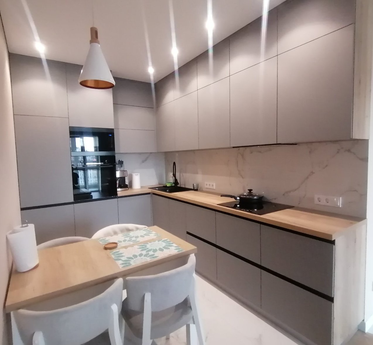 Кухня угловая 2400*3300. Каркас Egger Арктика серый. Фасады АГТ матовый. Столешница Egger дуб Галифакс натуральный. Фурнитура Blum. Подсветка рабочей зоны. Внутренняя подсветка шкафчиков. Сушка хромированная. На нижних фасадах профильная врезная ручка.