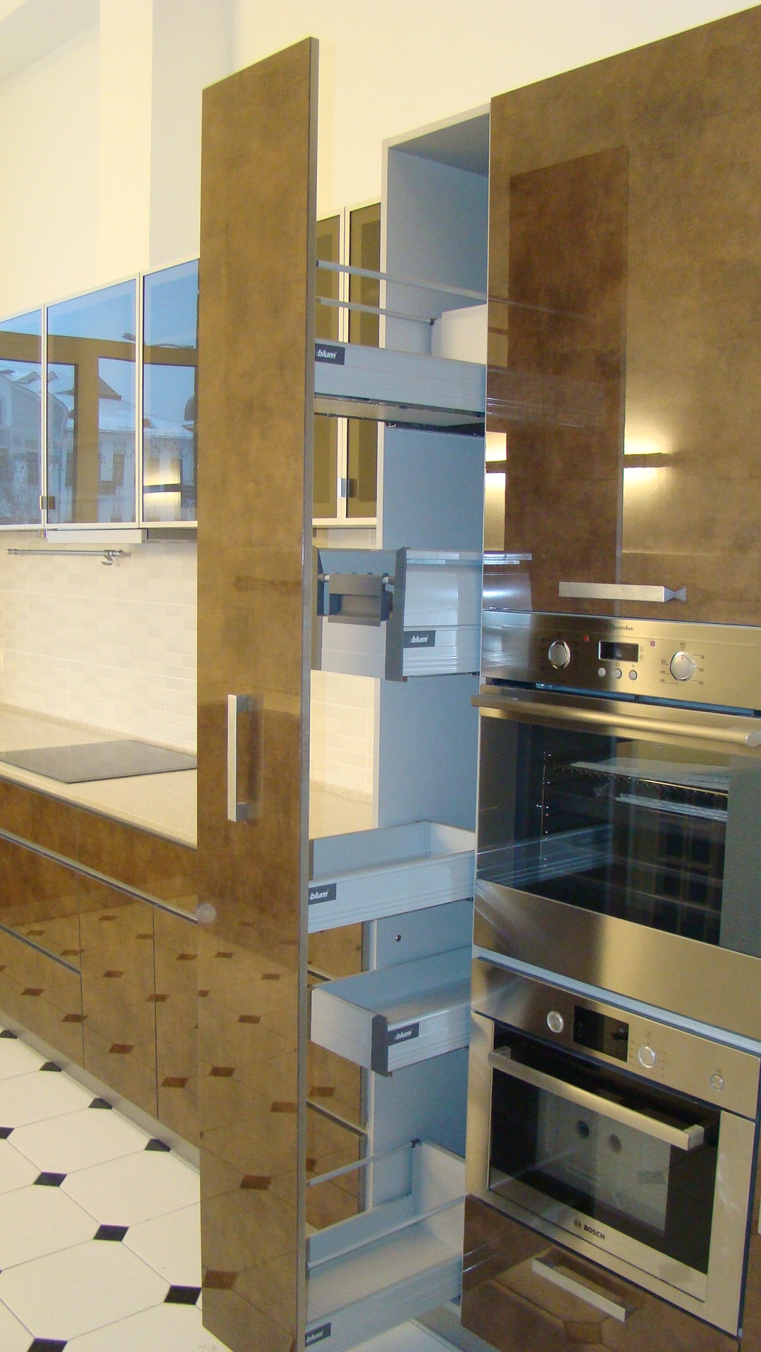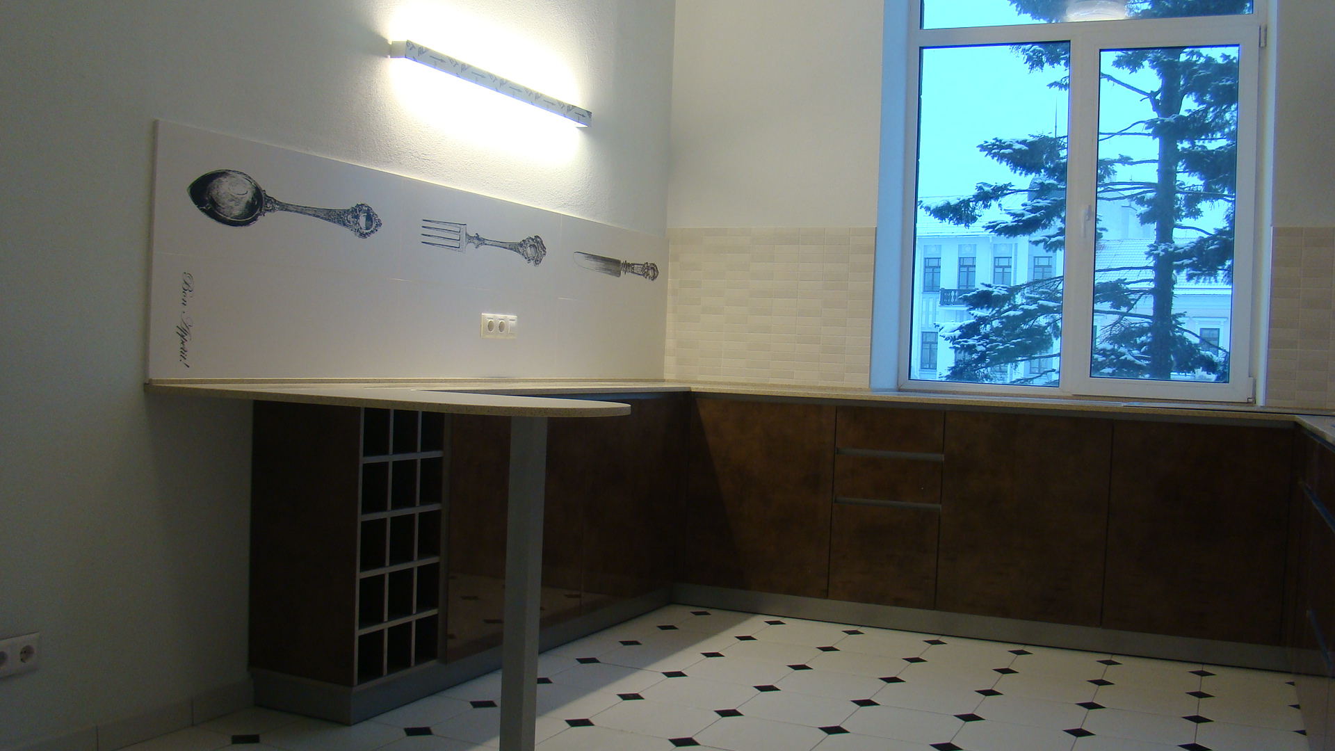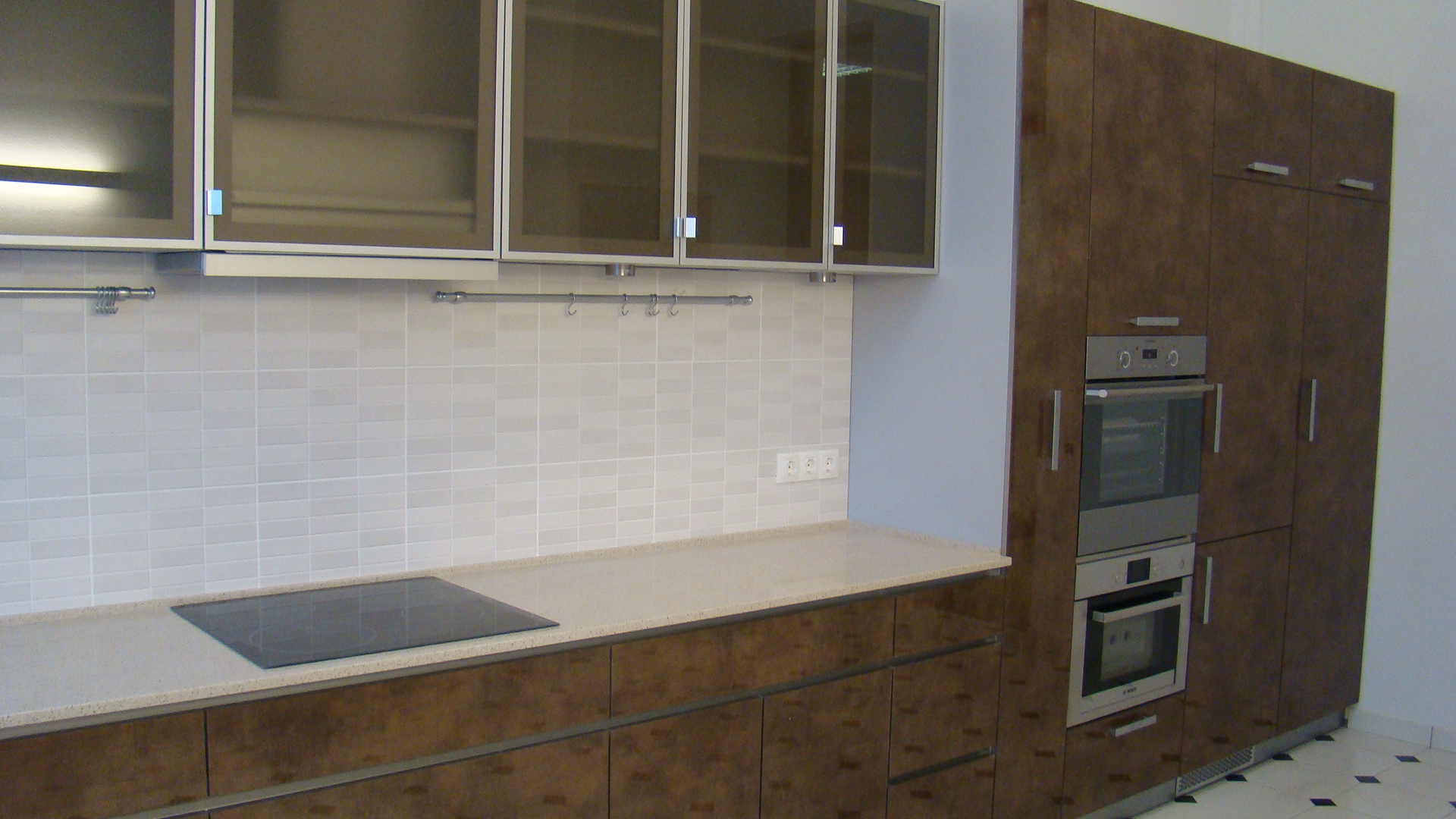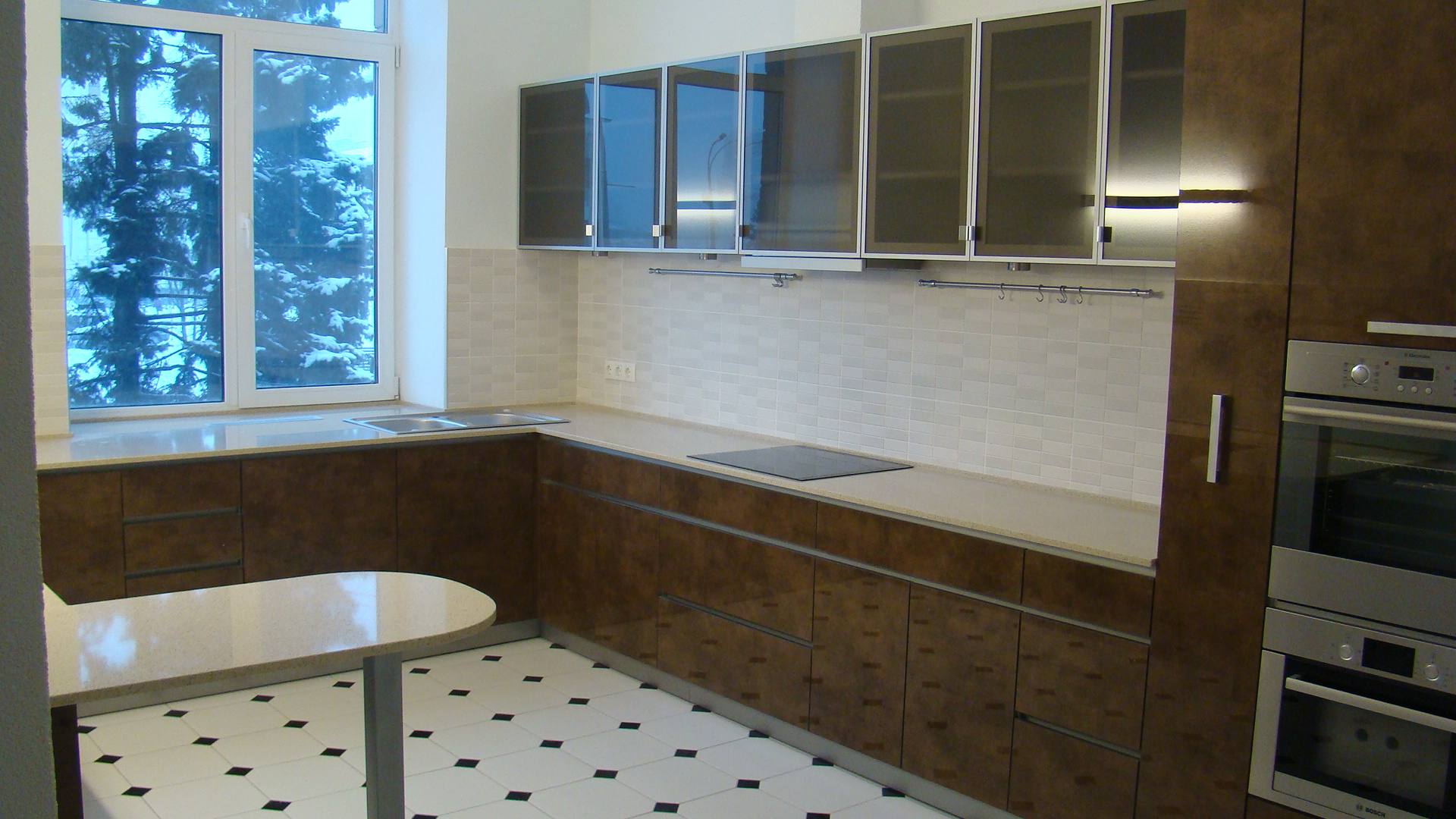 Комбинированные фасады из МДФ. Ширина кухни 230 см.