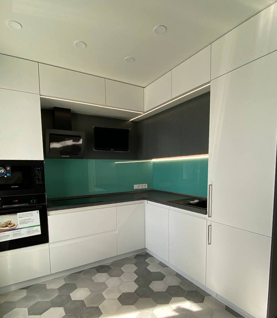 код 119984Двухуровневая подсветка. Скинали из каленого крашенного стекла. Фасады: МДФ крашенный.