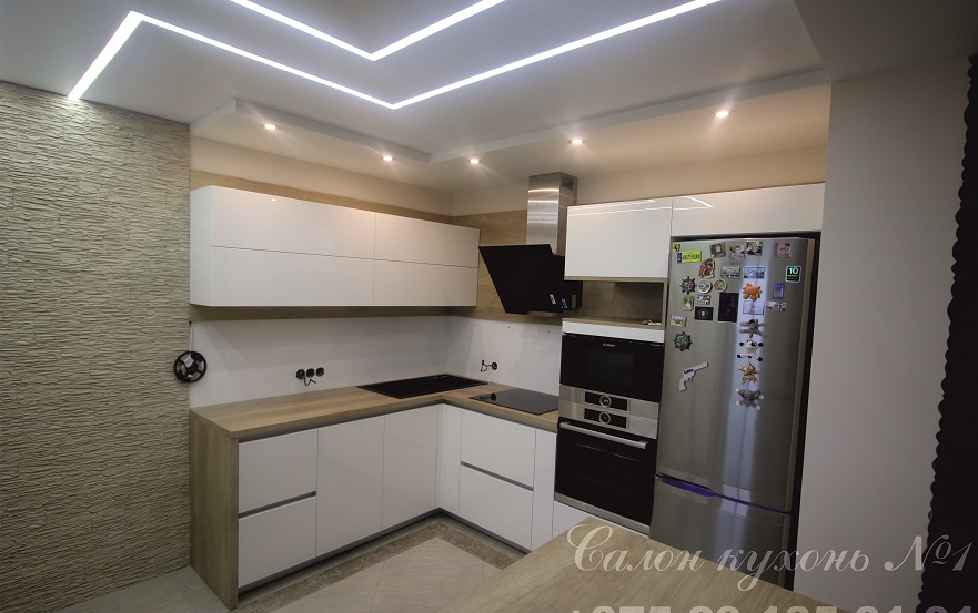 Небольшая угловая кухня с белыми глянцевыми фасадами.