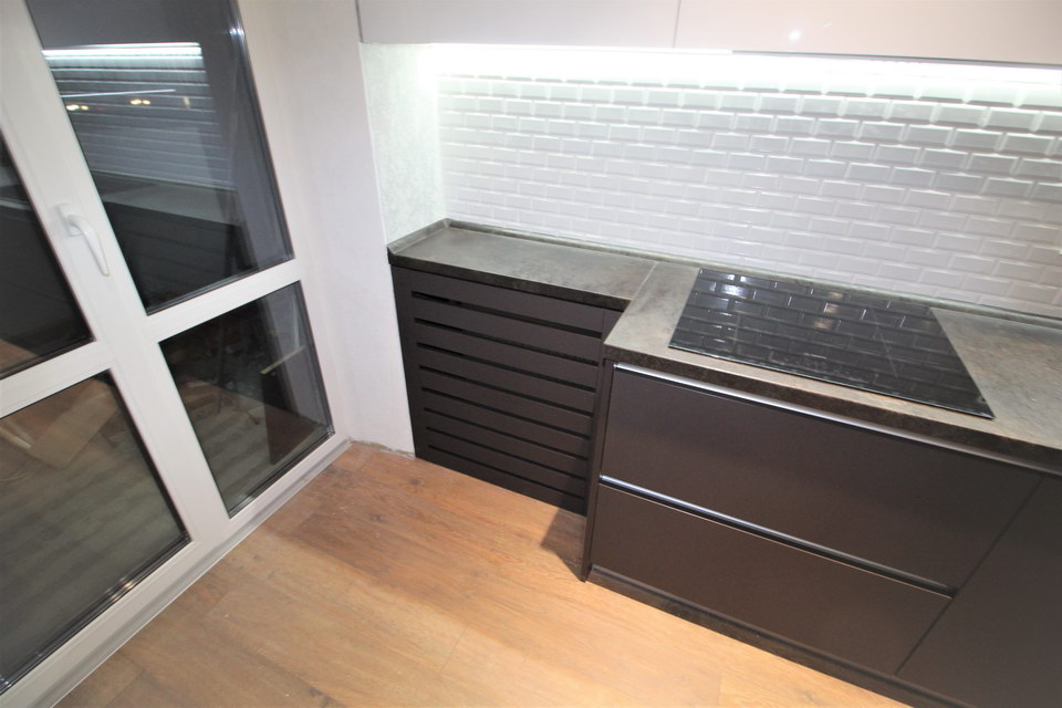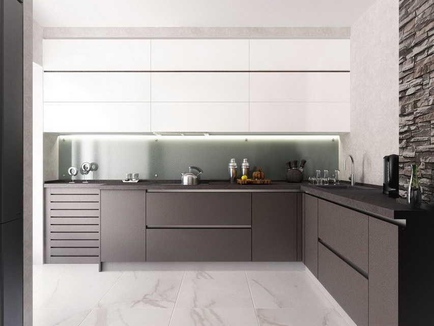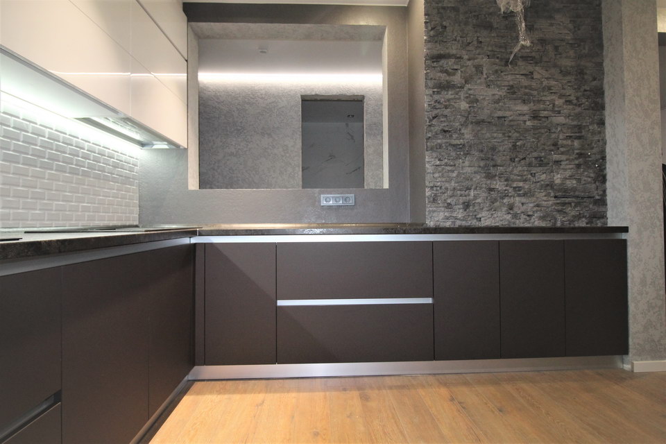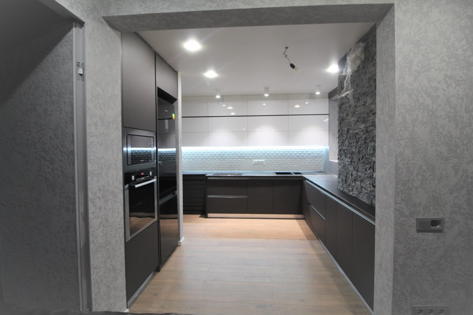 Кухня длиной 140 см. Стильное сочетание цветов фасадов.