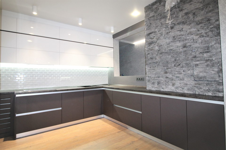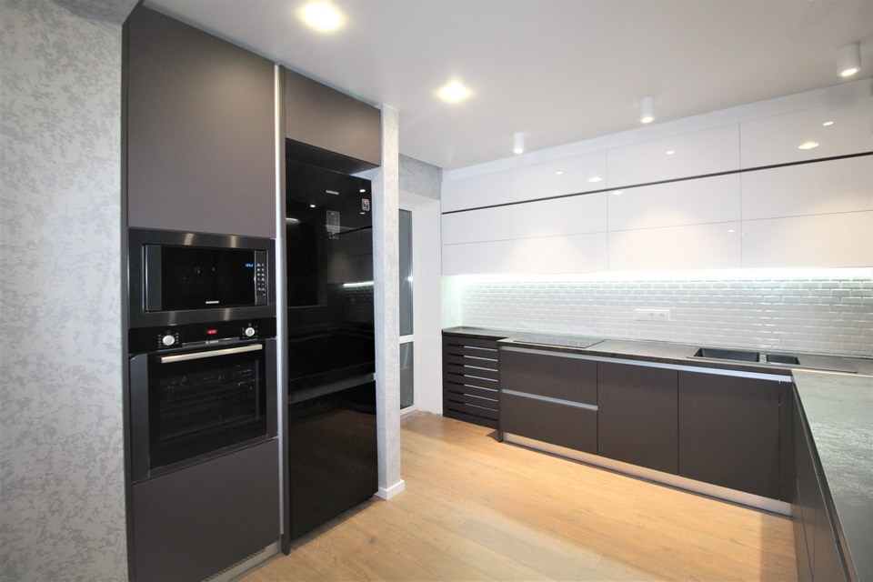 Современный гарнитур с интегрированными ручками, нишами для техники и полками.