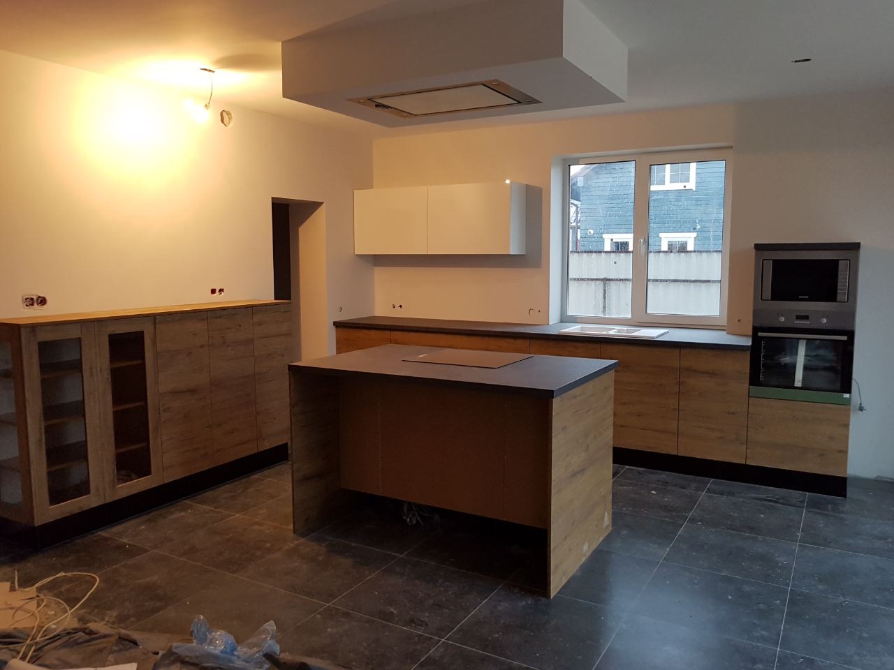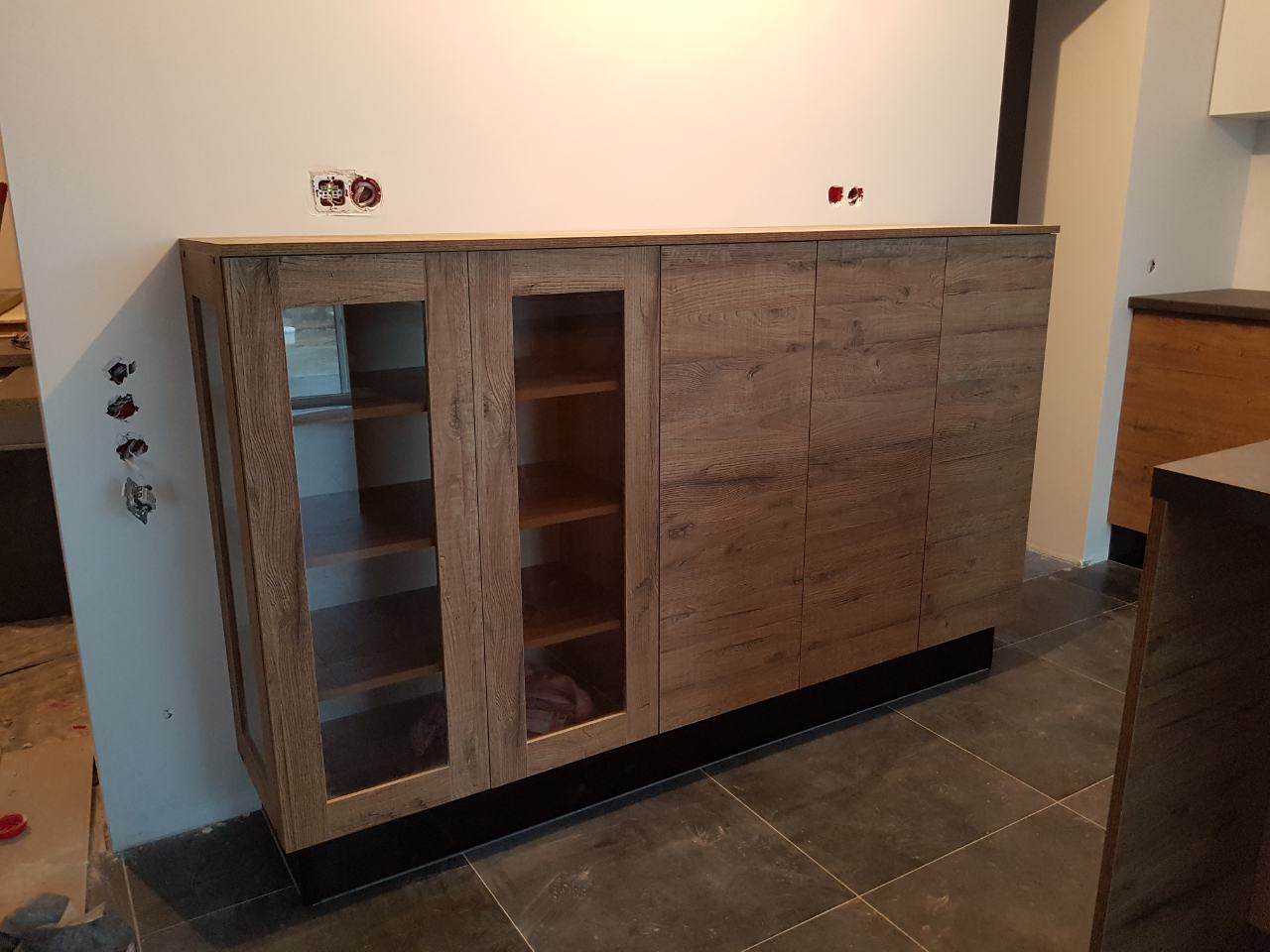 Фасады из ЛДСП в древесном оттенке. Корпус пепельного цвета.