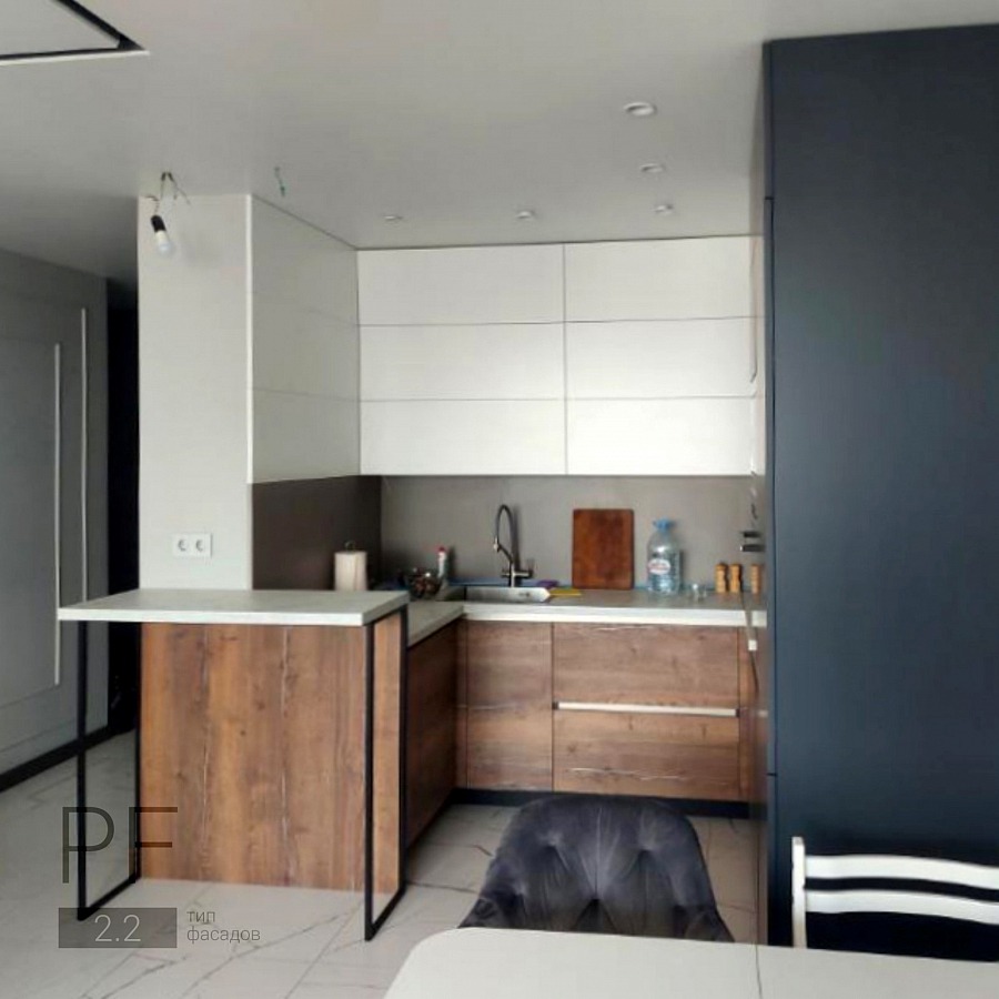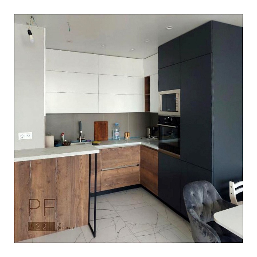 Стильная угловая кухня — отличное решение для небольшого пространства. Она не только функциональна, но и эстетически привлекательна. В дизайне кухни использованы фасады из разных материалов: крашеный МДФ и ДСП в нижних шкафах.