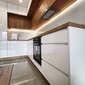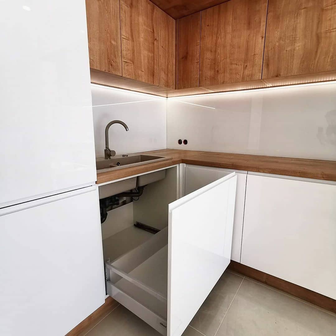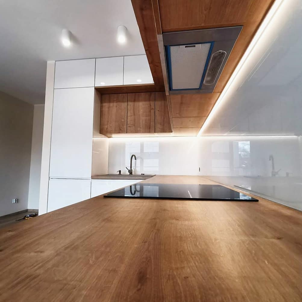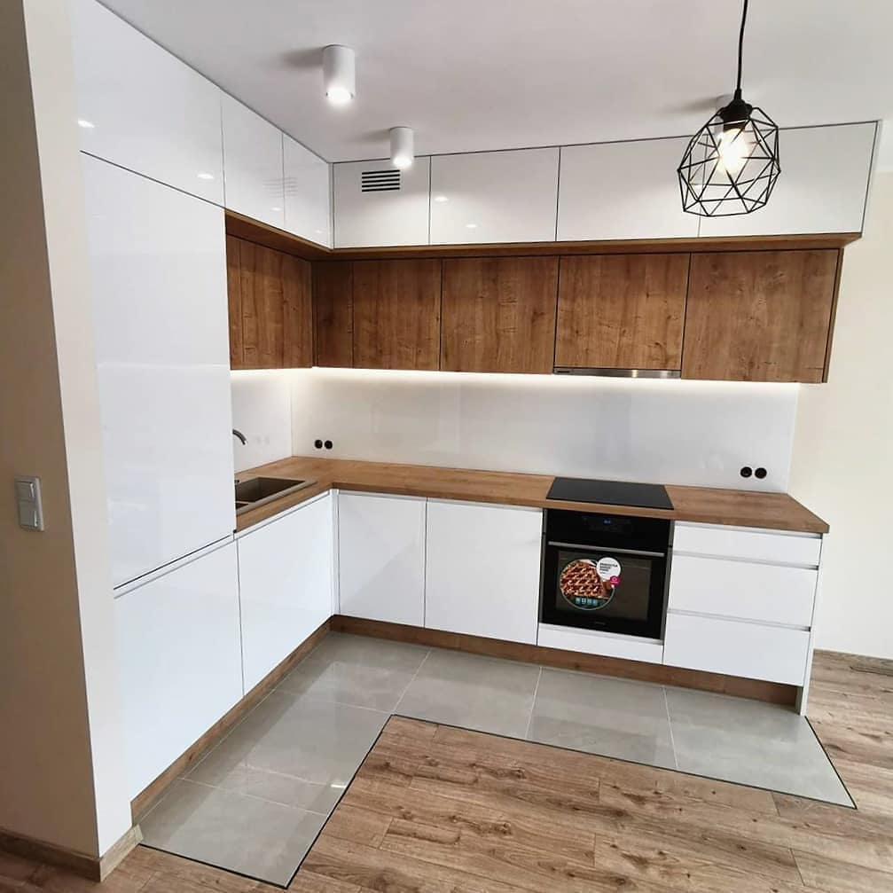 Комбинированные фасады, интегрированные ручки, подсветка рабочей зоны.