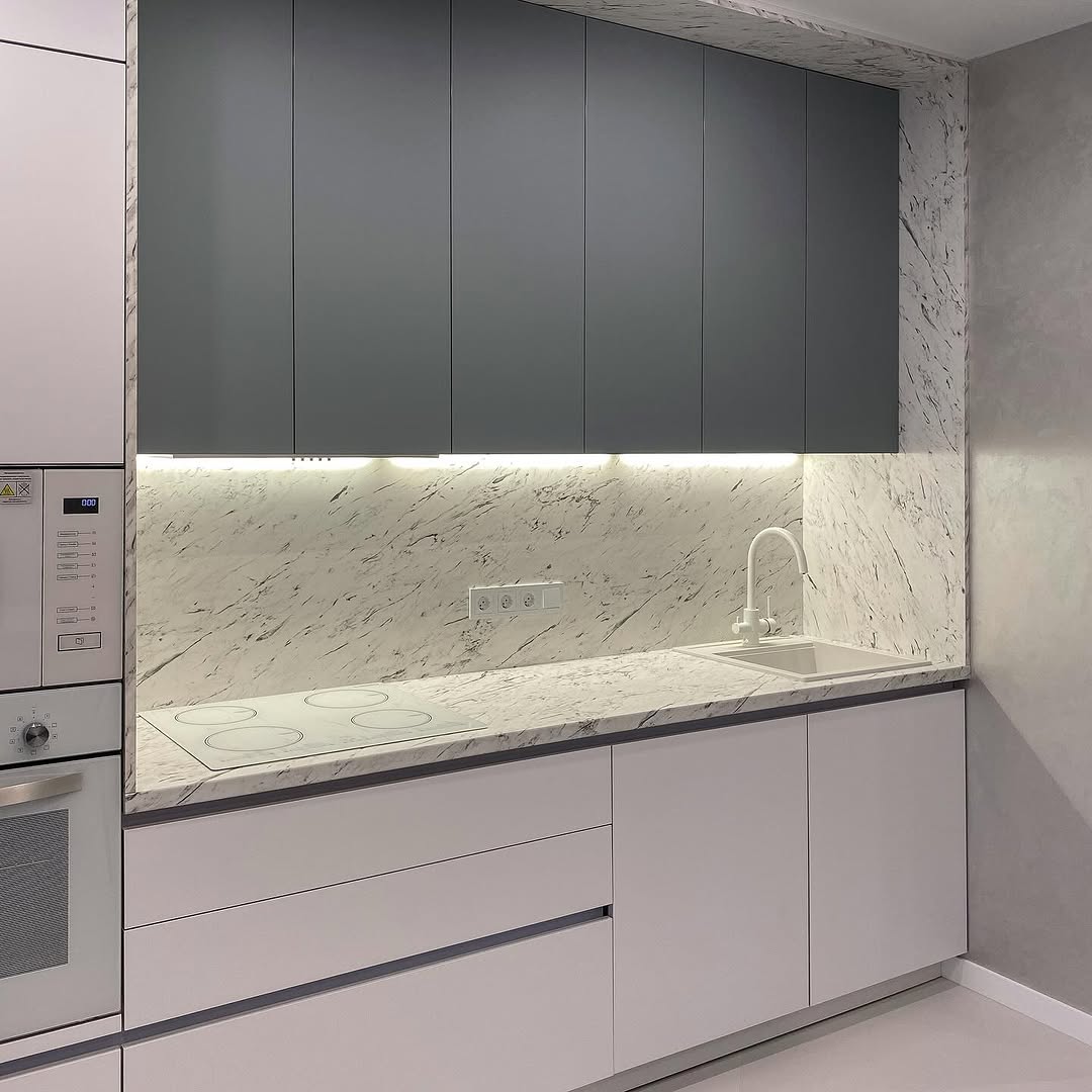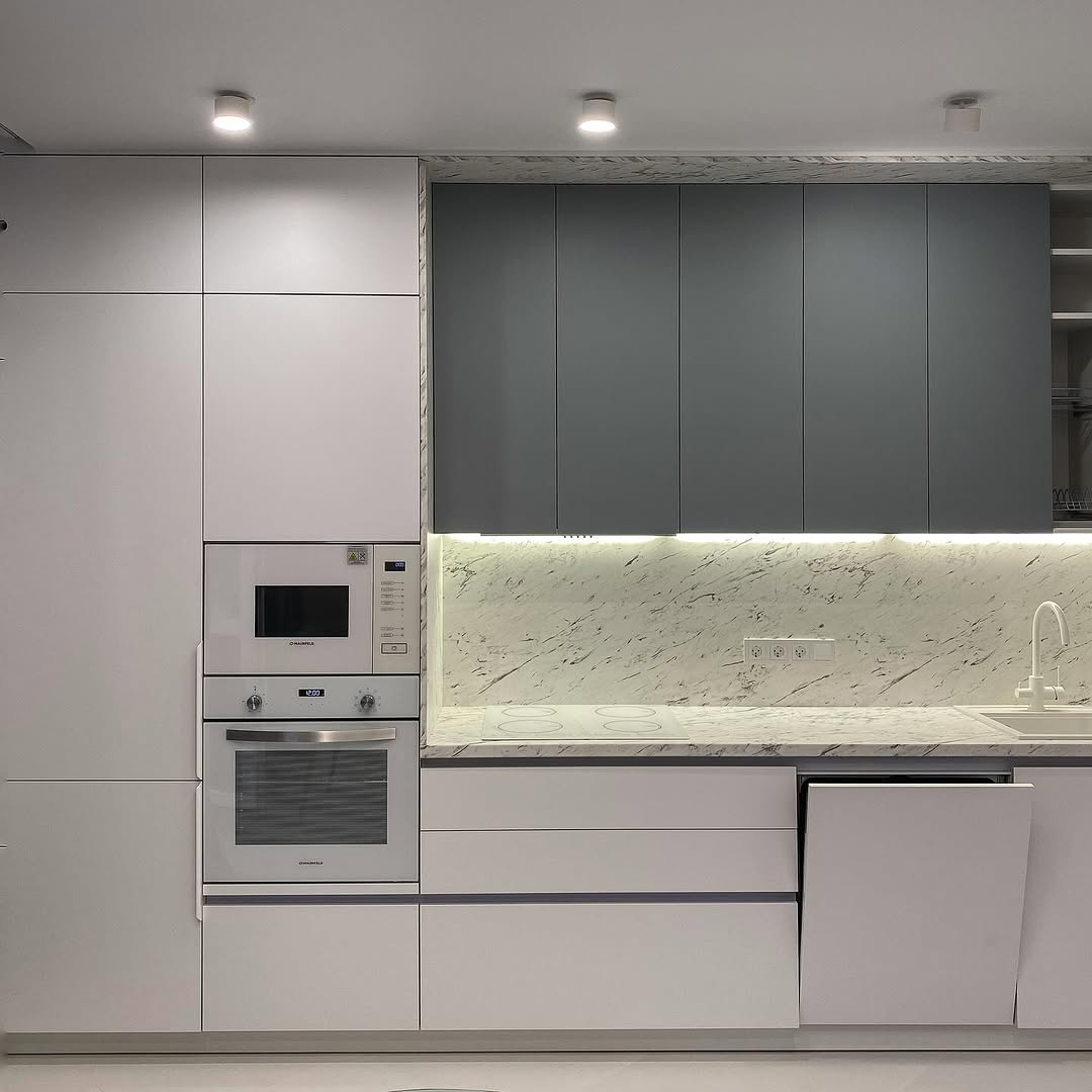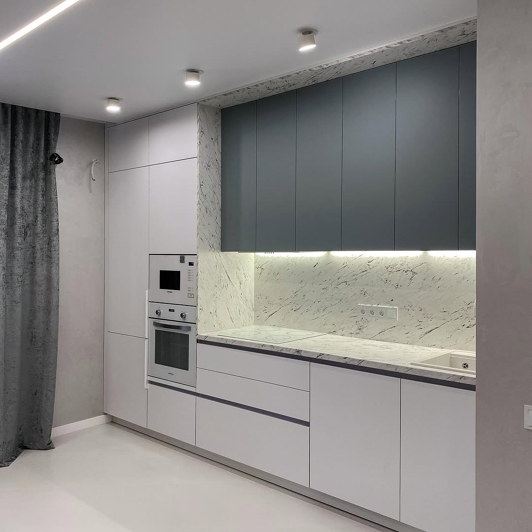 Элегантная кухня в светлых тонах с акцентом на мраморную текстуру — идеальный выбор для ценителей минимализма и современной эстетики. Контраст верхних тёмно-серых фасадов добавляет глубины интерьеру.