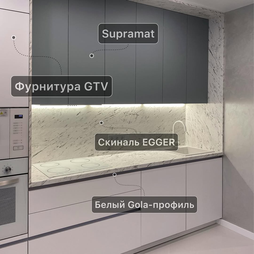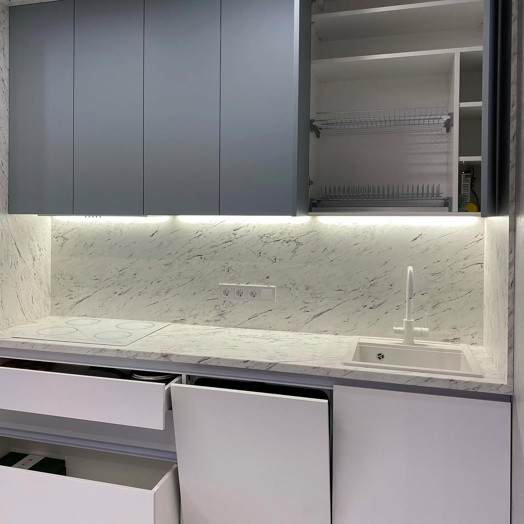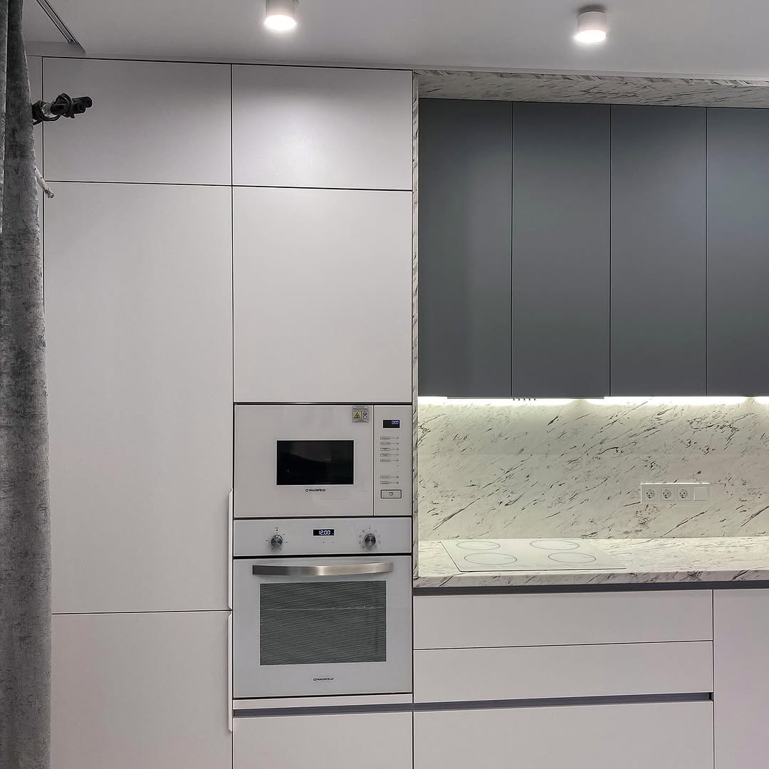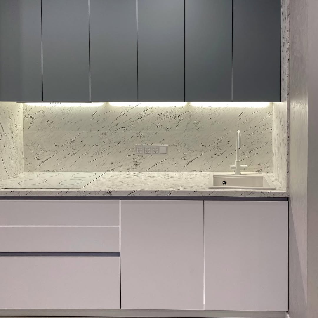 Элегантная кухня в светлых тонах с акцентом на мраморную текстуру — идеальный выбор для ценителей минимализма и современной эстетики. Контраст верхних тёмно-серых фасадов добавляет глубины интерьеру.