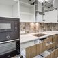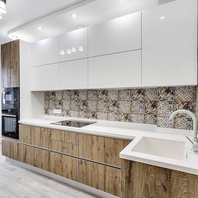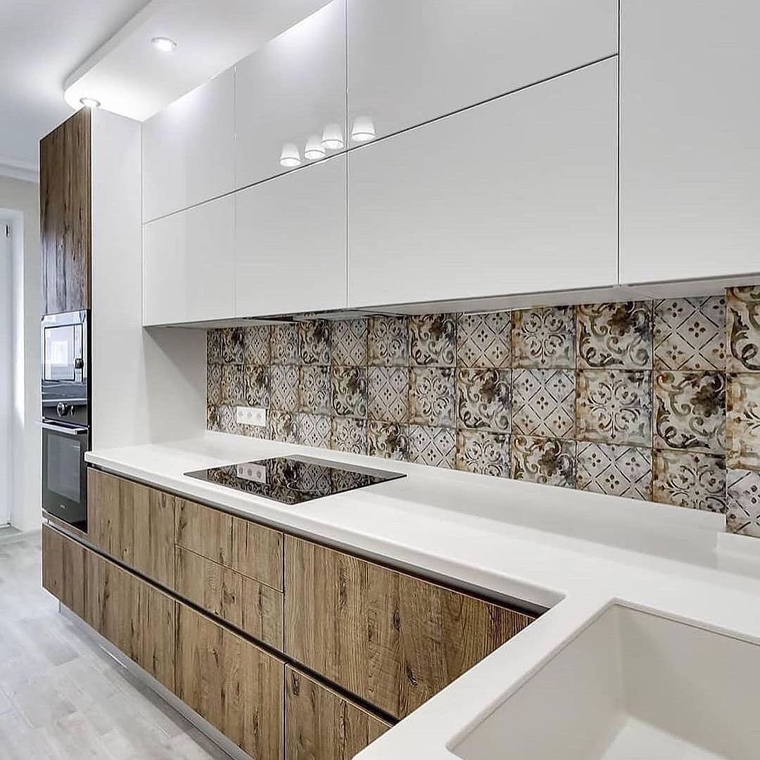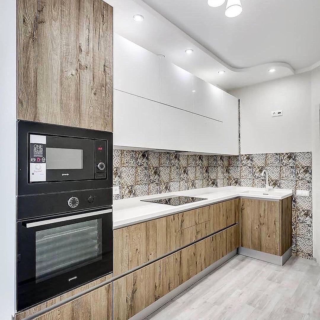 Стильная светлая комбинированная кухня с элегантным дизайном. Отсутствие ручек на фасадах придает ей современный и лаконичный вид.