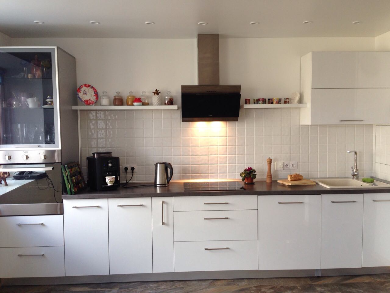 Линейная кухня имеет очень большую рабочую поверхность и многочисленные ящики и шкафы для хранения кухонной утвари. Фасад выполнен в белом цвете, и для создания интересного контраста дополнен темной столешницей. Также кухня оснащена большими открытыми полками и мини-буфетом со стеклянной створкой.