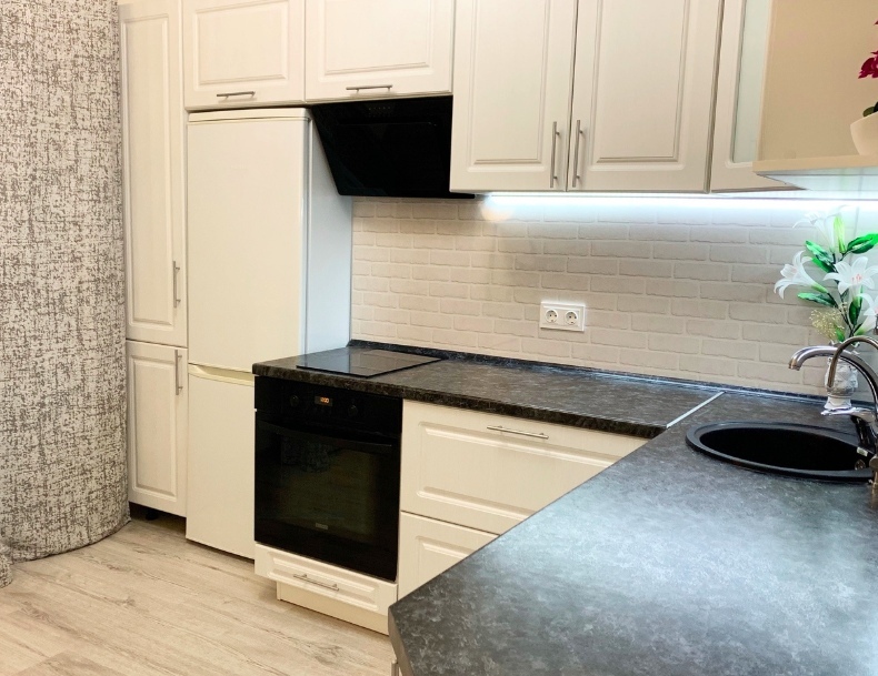 Белые фасады с фрезеровкой. Ширина кухни 170 см.