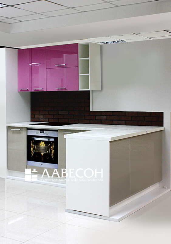 код 86584Глянцевый верх цвета фуксии с открытым стеллажом. Низ матовый серый с белой столешницей.