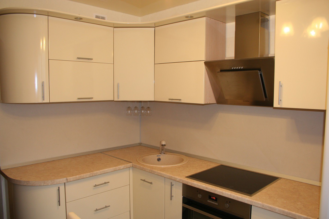 Кухонный гарнитур с радиусным фасадом оформлен в насыщенный белый цвет. Светлый тон на глянцевом фасаде создает колоритную атмосферу, идеально подходящую для готовки. Легкий бежевый цвет столешницы гармонично дополняет светлый тон оформления кухни. Обилие полочек и шкафчиков с традиционной фурнитурой позволит без проблем хранить массу кухонных принадлежностей.