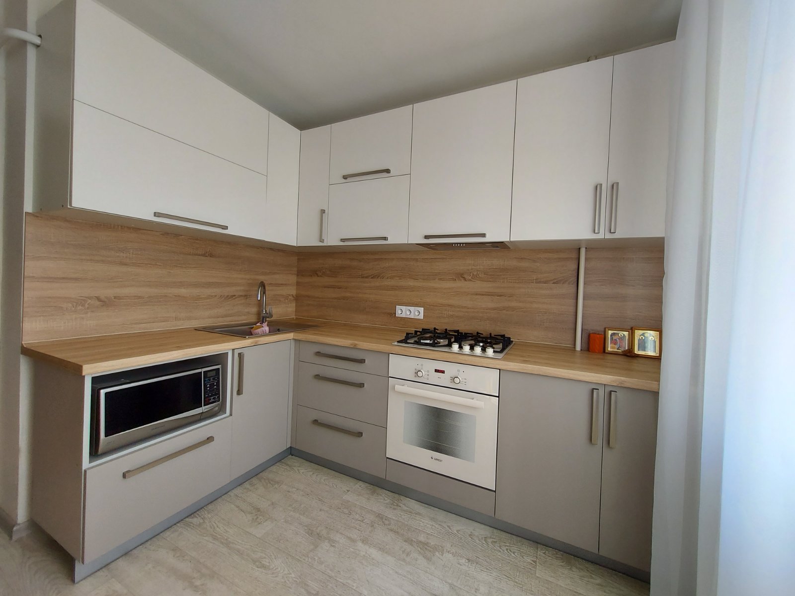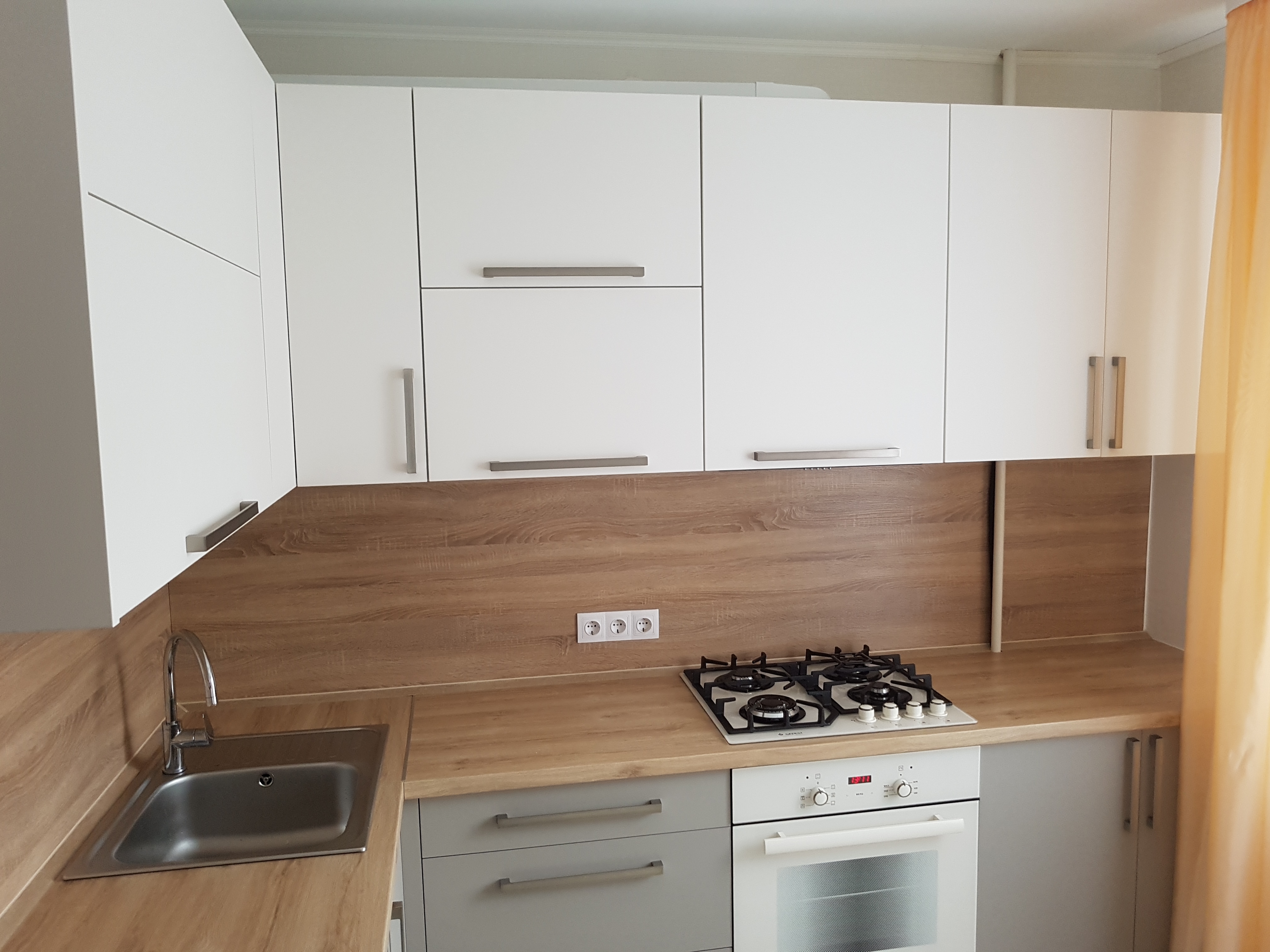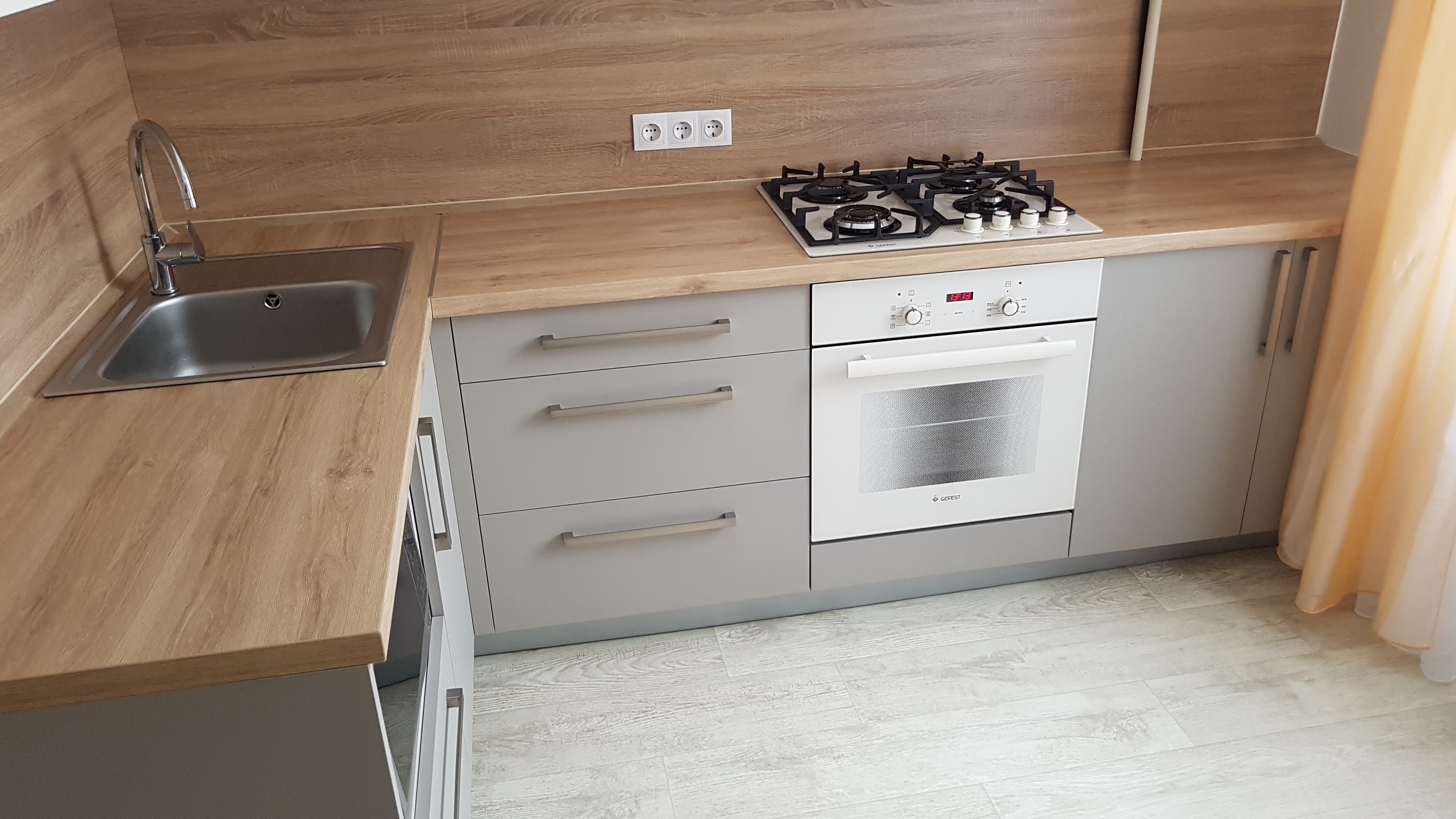 Светлые фрезерованные фасады. Ширина кухни 160 см.