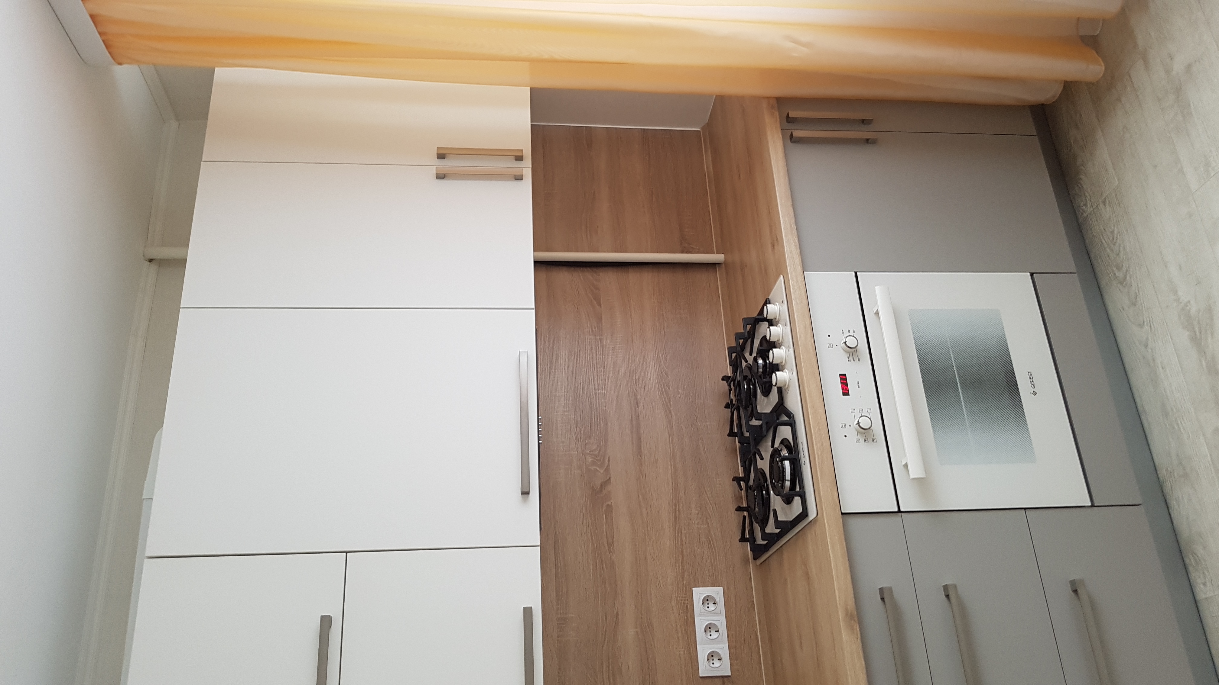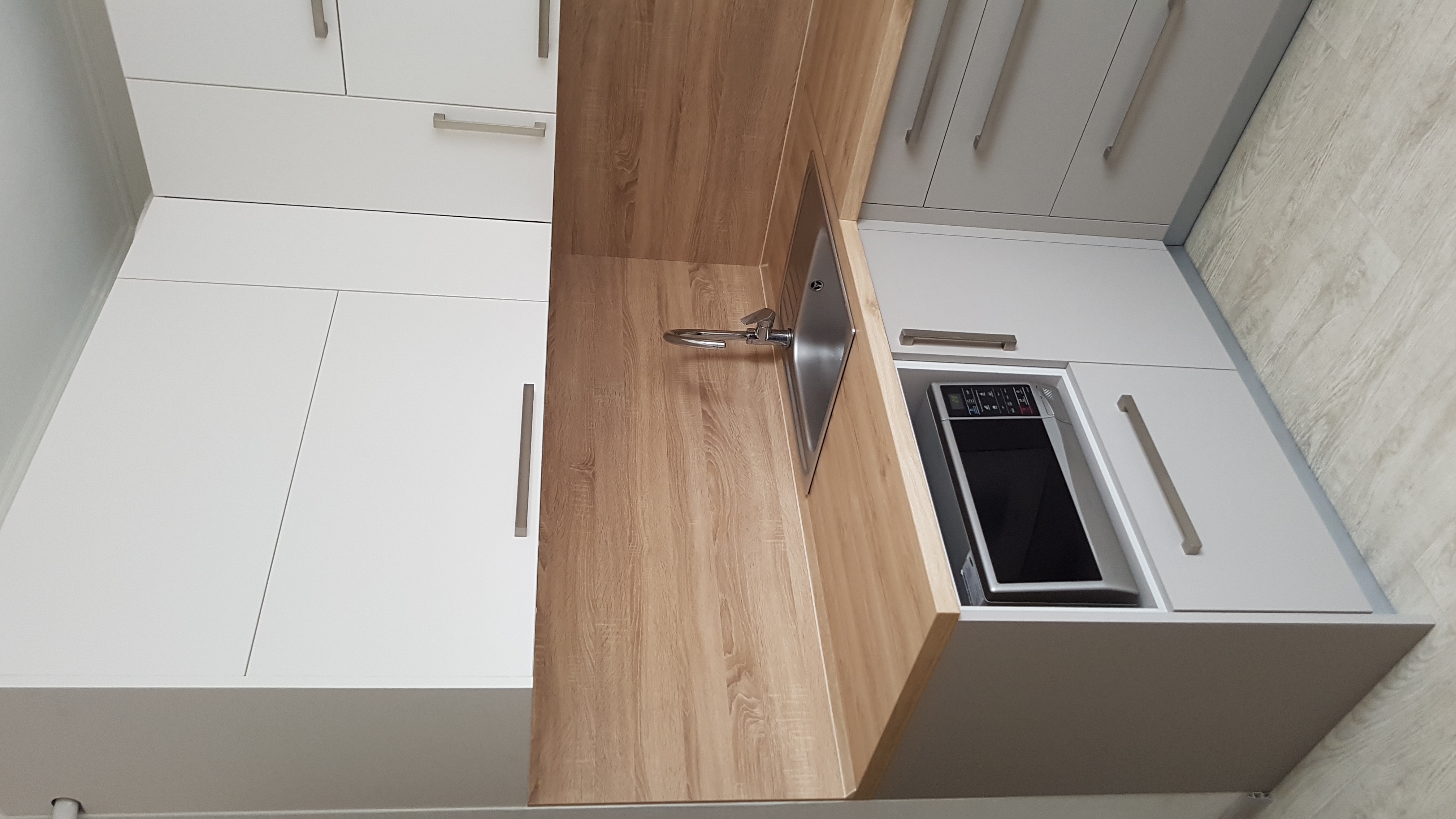 Светлые глянцевые фасады. современная и надежная фурнитура, ниши для техники.