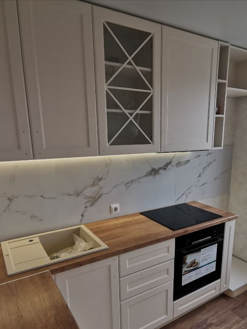 Современная линейная кухня с вместительными шкафчиками. Качественные материалы.