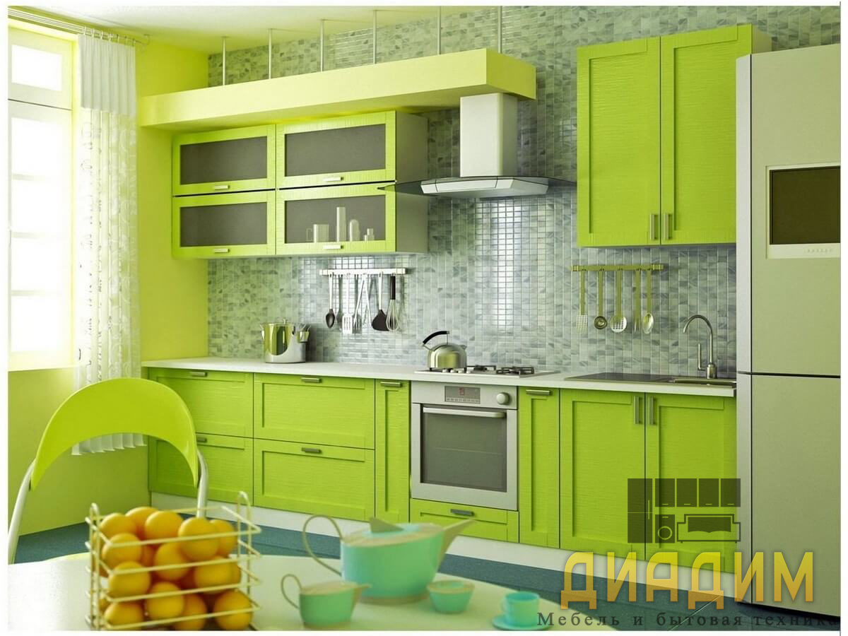 Яркая салатовая кухня «освежит» интерьер и придаст атмосфере более позитивный характер. Она по форме прямая. Поверхность фасадов матовая. Фурнитура металлического окраса простая и не броская. Столешница белого цвета выделяется на общем фоне. Данная модель удобна в эксплуатации. Она не будет загромождать помещение.