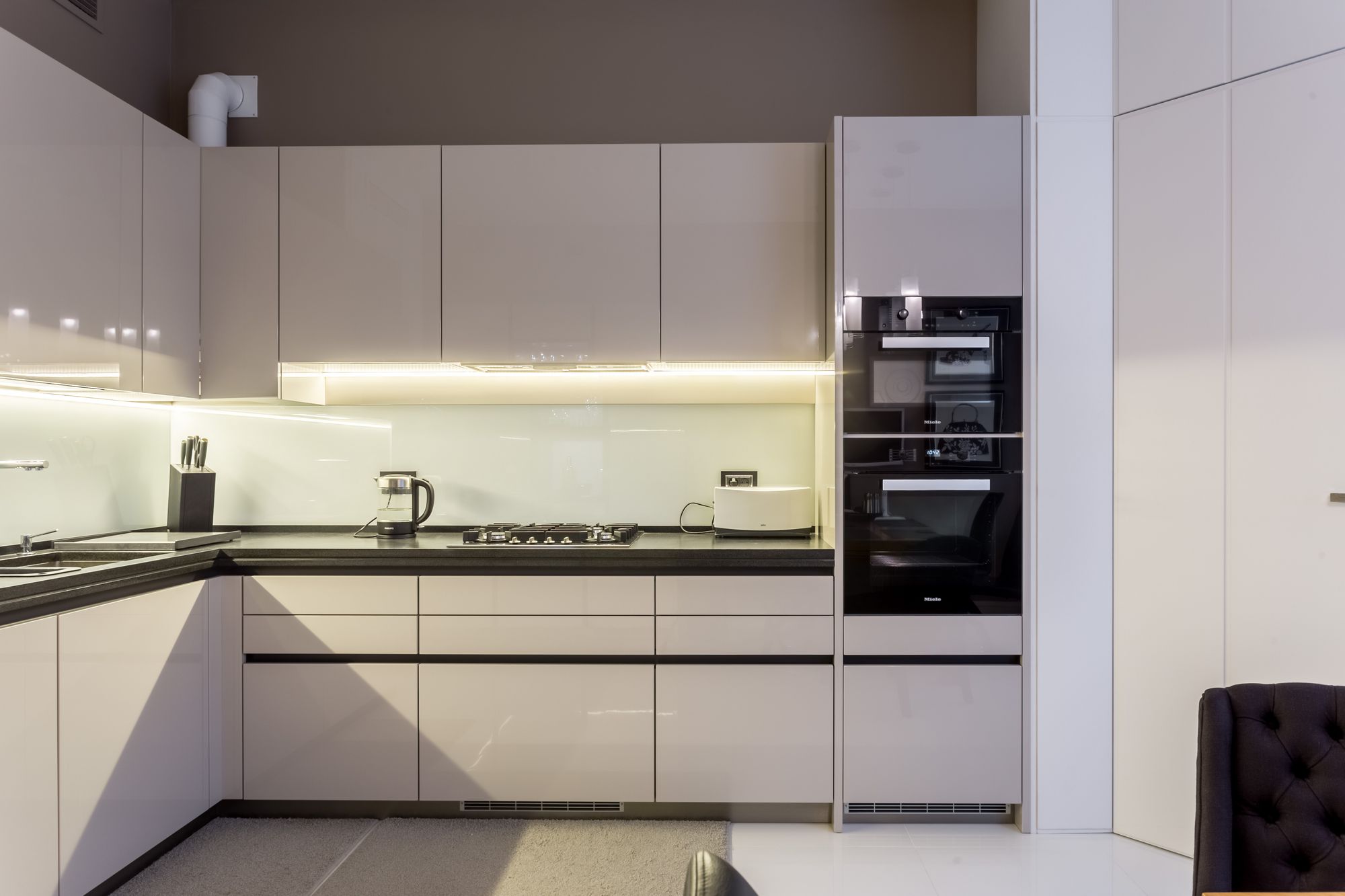 Белая кухня в глянцевых фасадах с врезными ручками и встроенной подсветкой. В торце удачно расположен шкаф для встроенной духовки и другой техники. Кухня изготавливается под встроенную вытяжку.