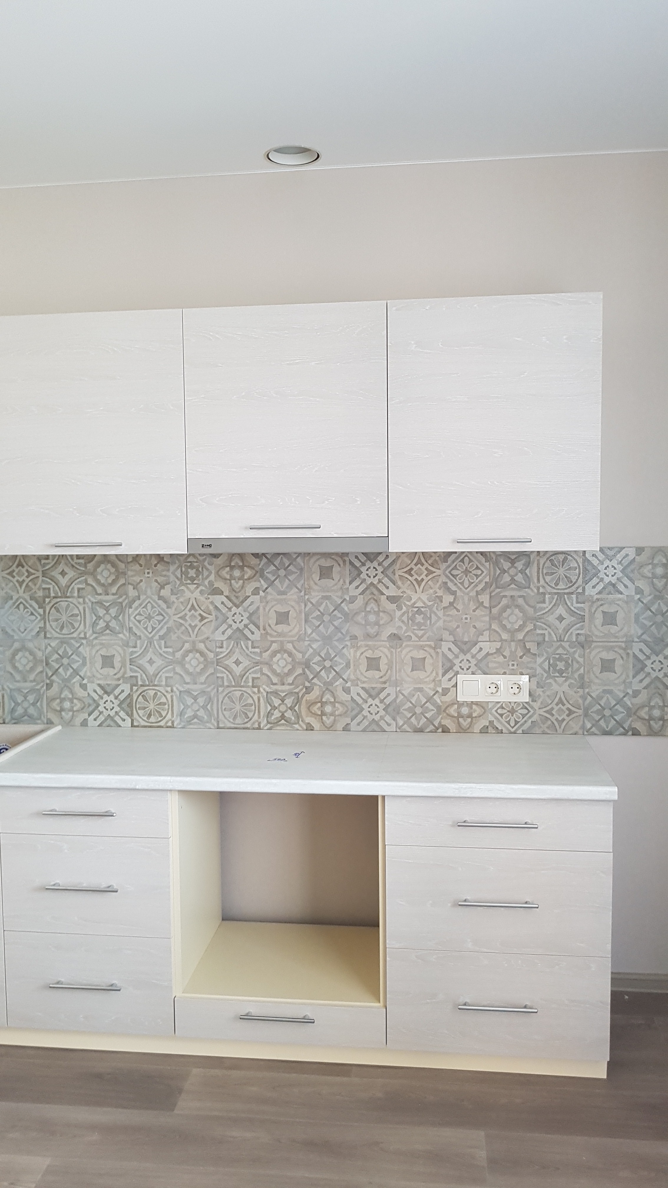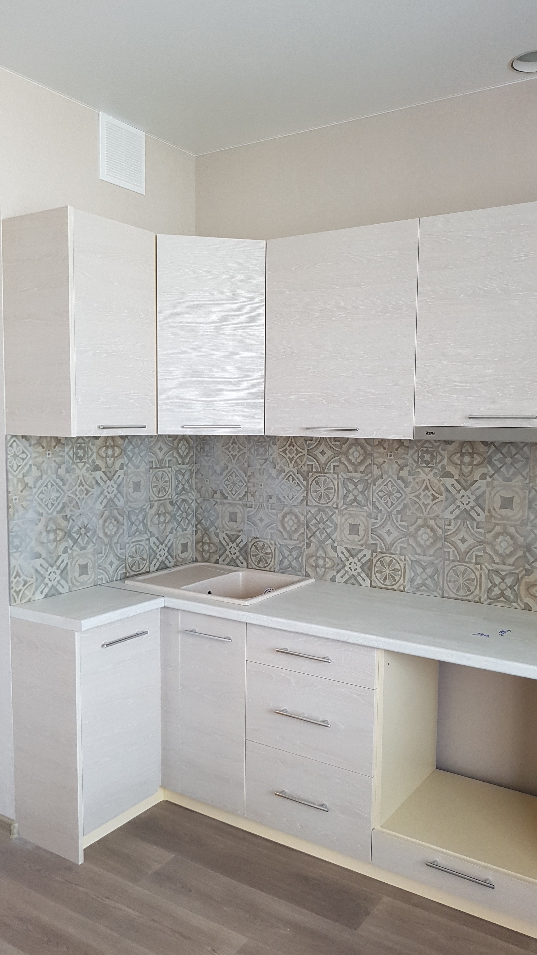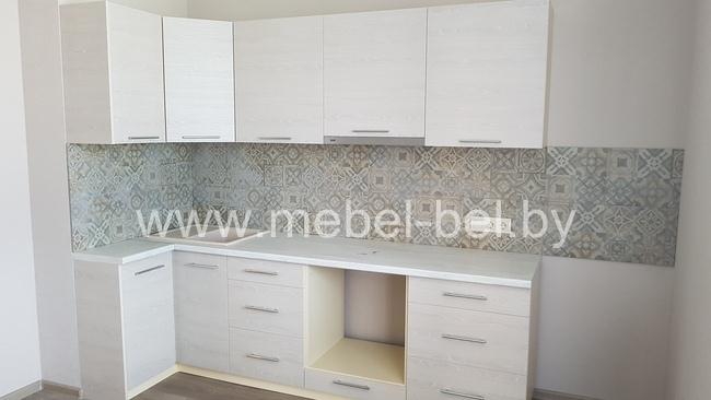Компактная современная кухня с множеством вместительных ящиков с распашными и выдвижными дверцами, отделениями для духового шкафа и вытяжки, накладной мойки. Данная кухня не занимает много место, но при этом дает возможность в полной мере реализовать свои кулинарные идеи благодаря глубокой столешнице и удобному расположению всех функциональных элементов. А необычный геометричный дизайн плиточной скинали придаст неповторимый облик вашей кухне.