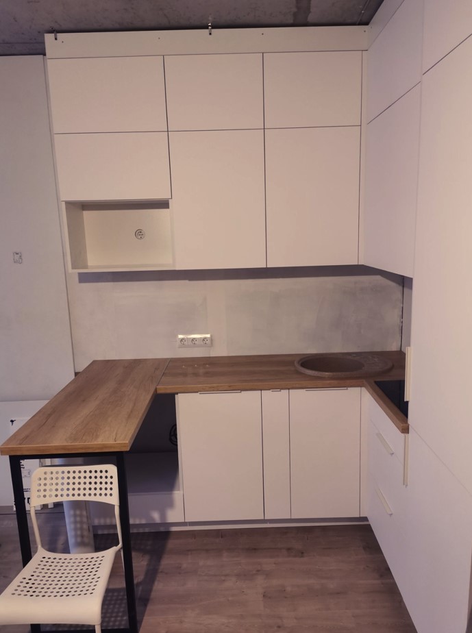 Встроенный холодильник, в верхних шкафчиках расположена СВЧ.
