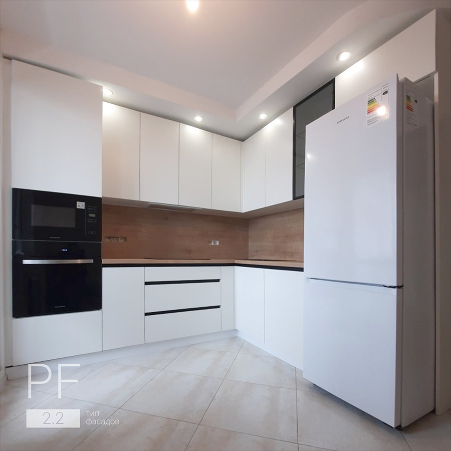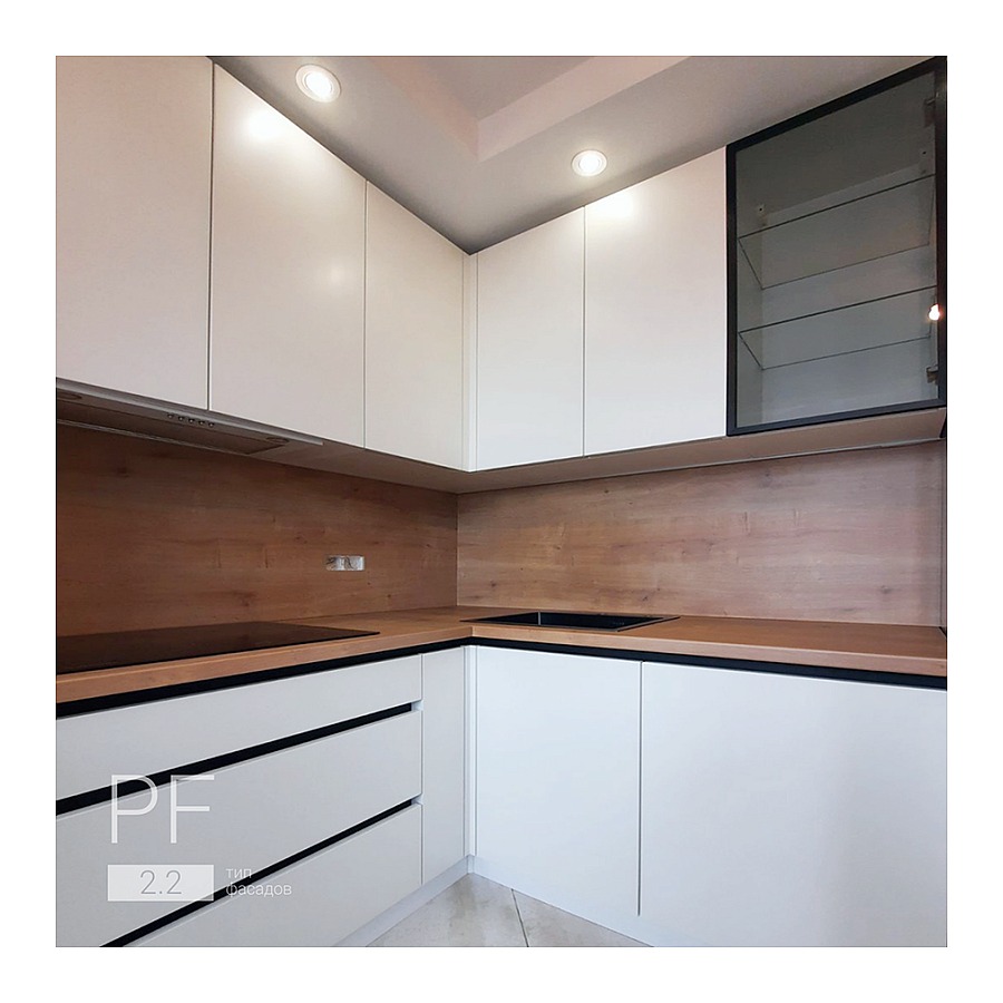 Идеальная кухня, четкая, аккуратная, без лишних деталей. Светлые фасады и древесная столешница - такое сочетание цветов выбирают многие заказчики и это не удивительно, это красиво, комфортно и беспроигрышно. Акцентный черный профиль и алюминиевый фасад-витрина в профиле Z1 modus идеально подходят под черную встраиваемую технику.