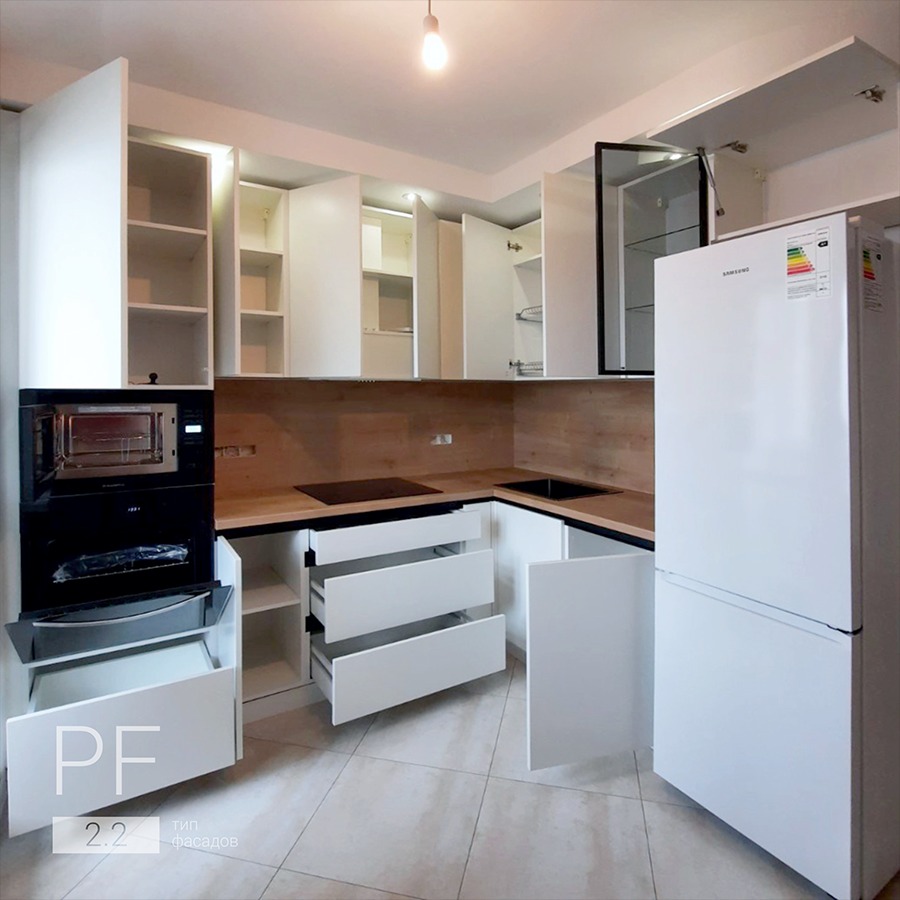 Комбинированные фасады из МДФ. Ширина кухни 170 см.