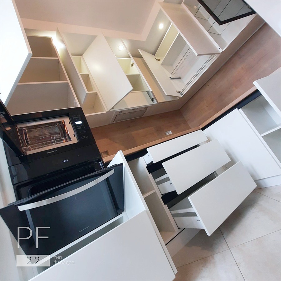Фурнитура: BLUM (Австрия), Ручки: Gola-профиль, цвет - Черный, Сушка: INOXA (Италия), цвет – Серый