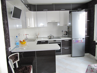 Угловая глянцевая кухня выполнена из прочных высококачественных материалов европейского производства. Фасады верхних шкафов окрашены в белый цвет и имеют глянцевую структуру поверхности.