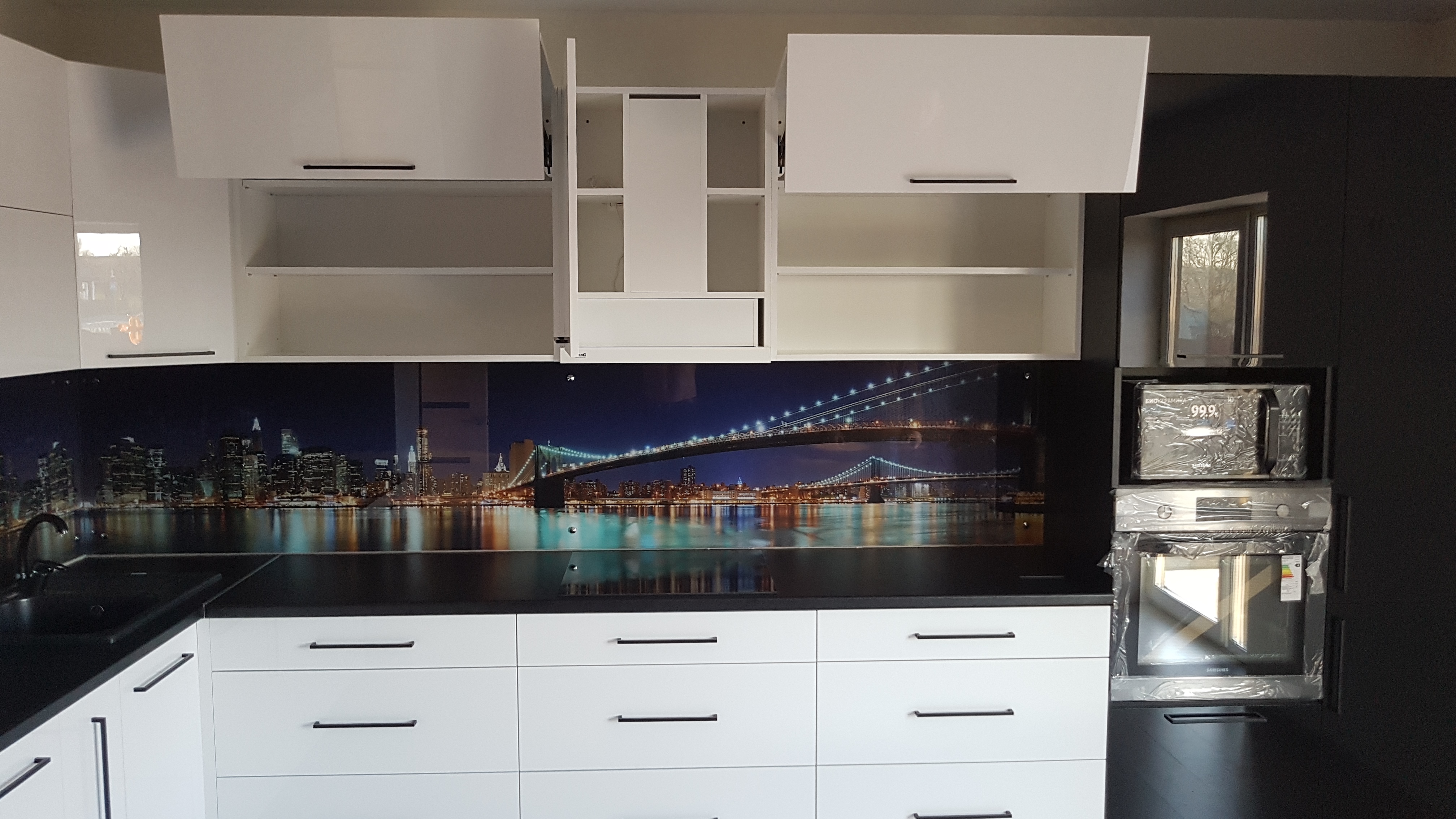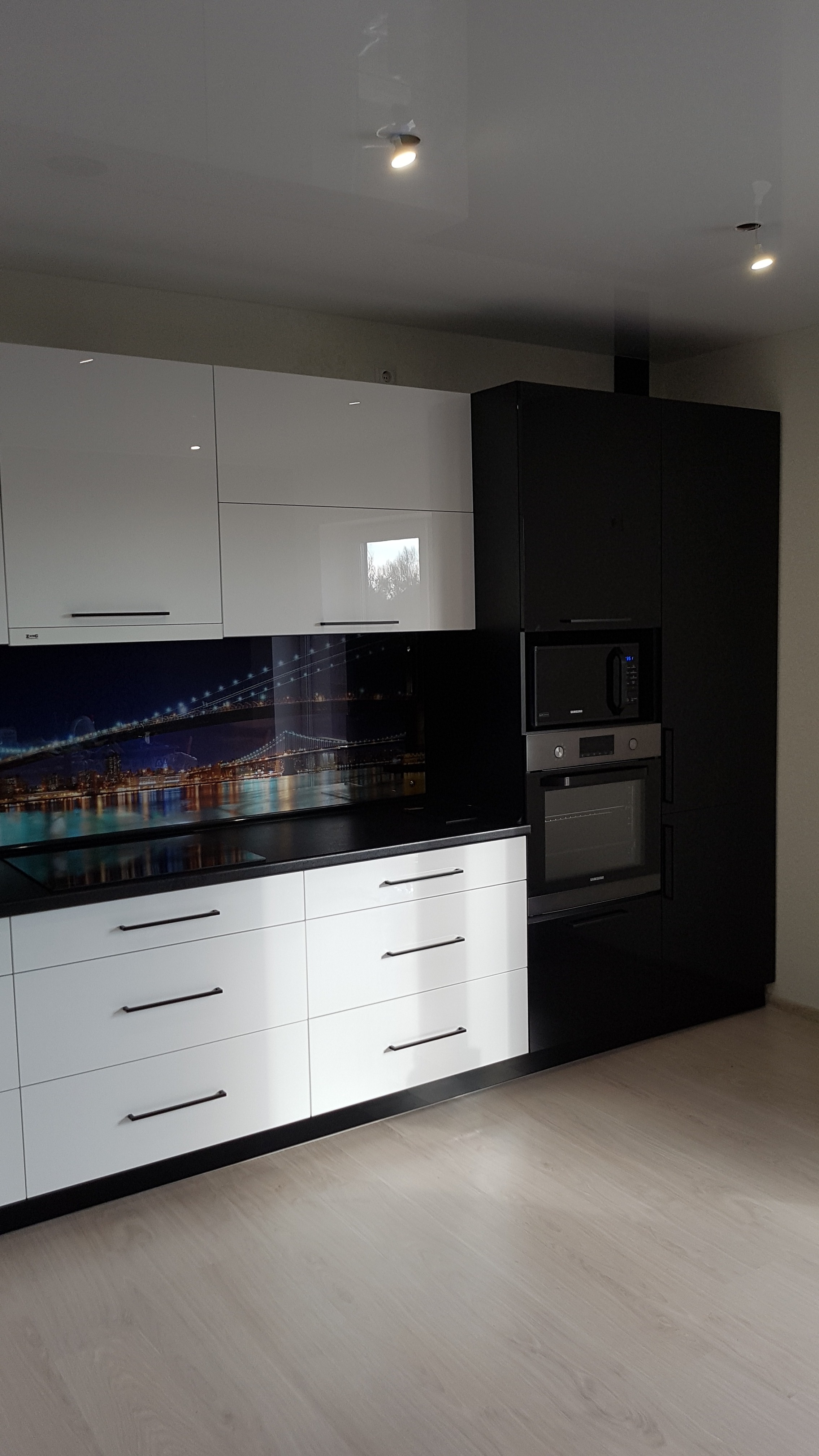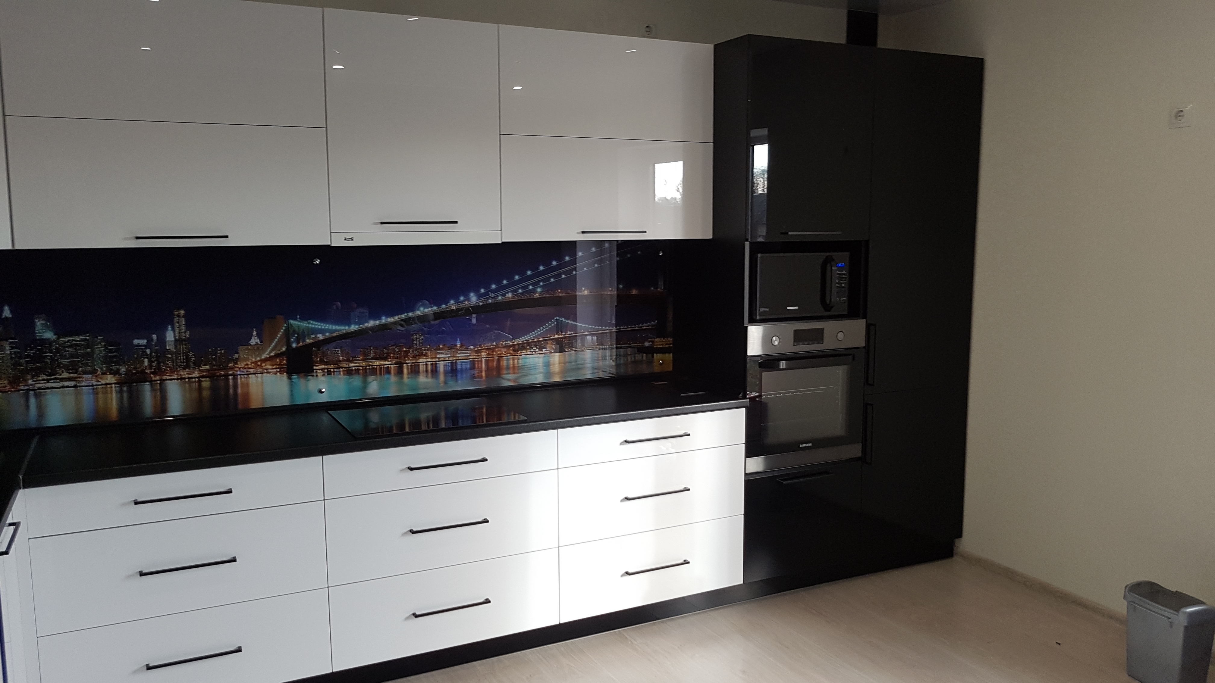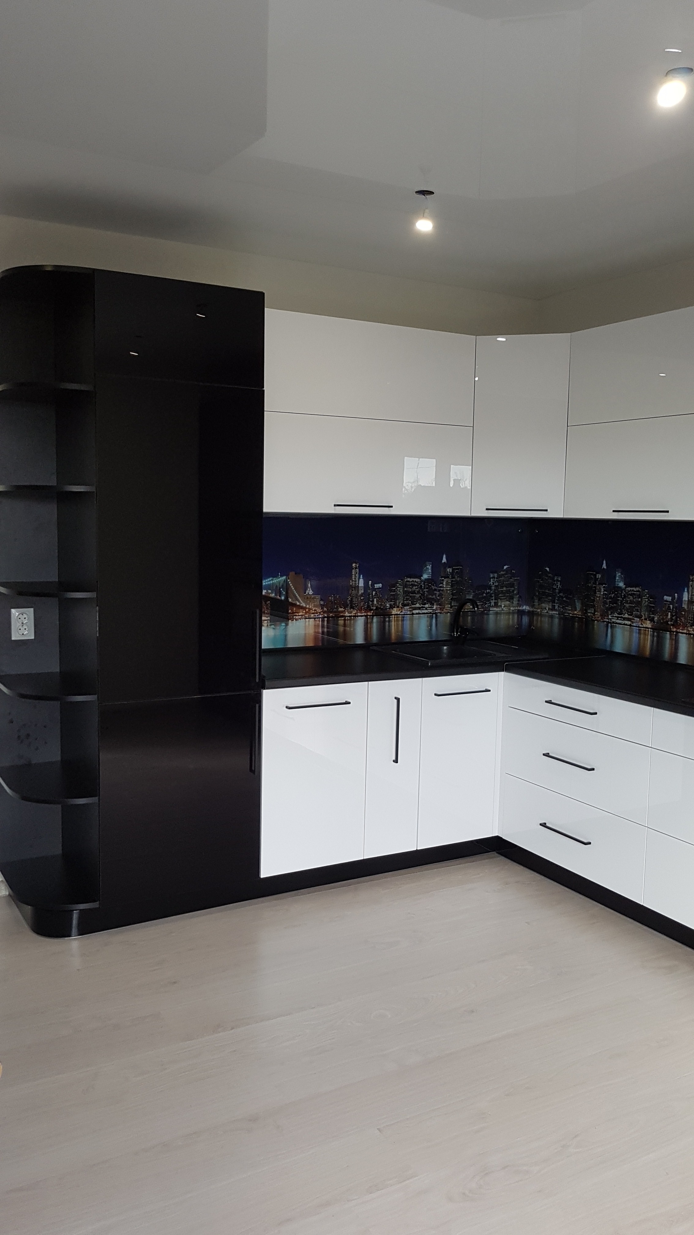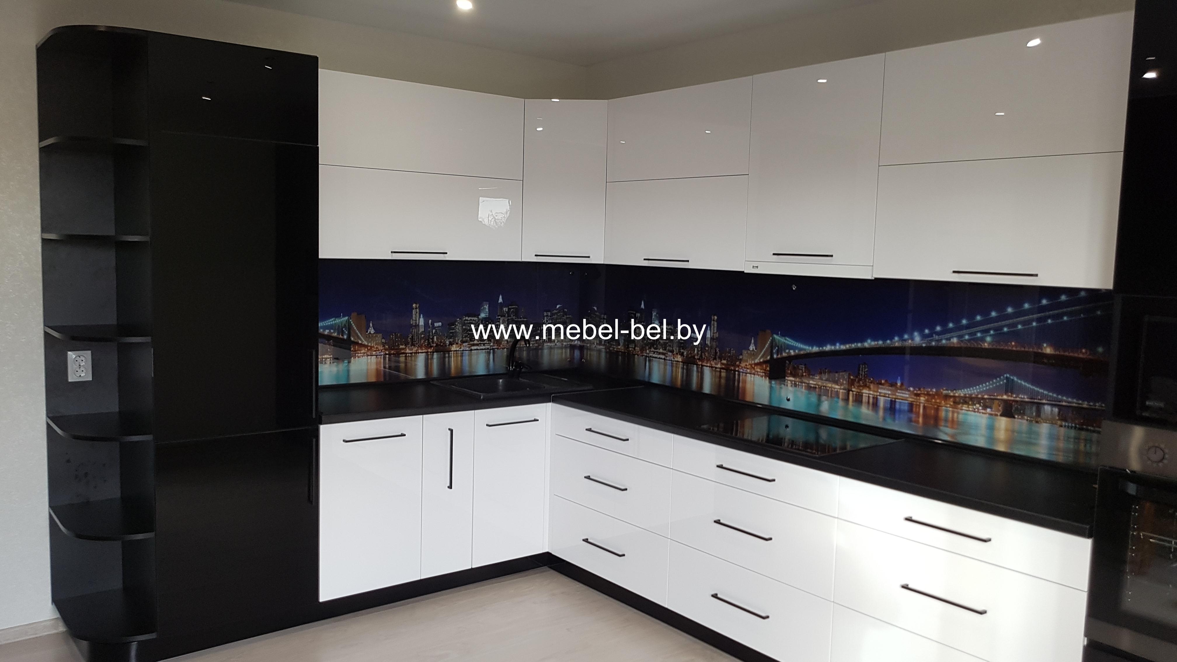 Угловой кухонный гарнитур выполнен в чёрно-белом цвете, имеет стильный и современный дизайн. Угловое расположение позволяет рационально использовать пространство кухни, а также повысить удобство размещения рабочих зон.Скинали с фотопечатью ночного мегаполиса выгодно выделяется на фоне белоснежных фасадов, расширяет и подчеркивает зону готовки.